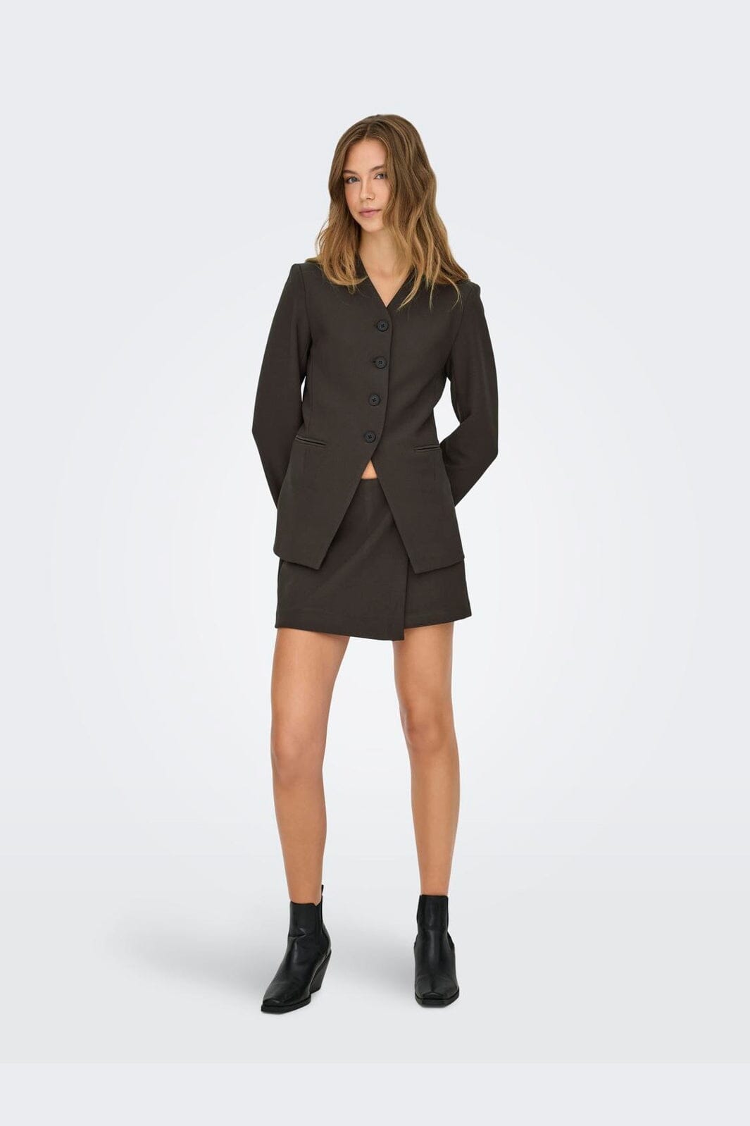 Tummanruskea skort Onlylta, jossa on epäsymmetrinen etuliepitys. Skortissa on kesikorkea vyötärö ja reiden pituinen helma.
