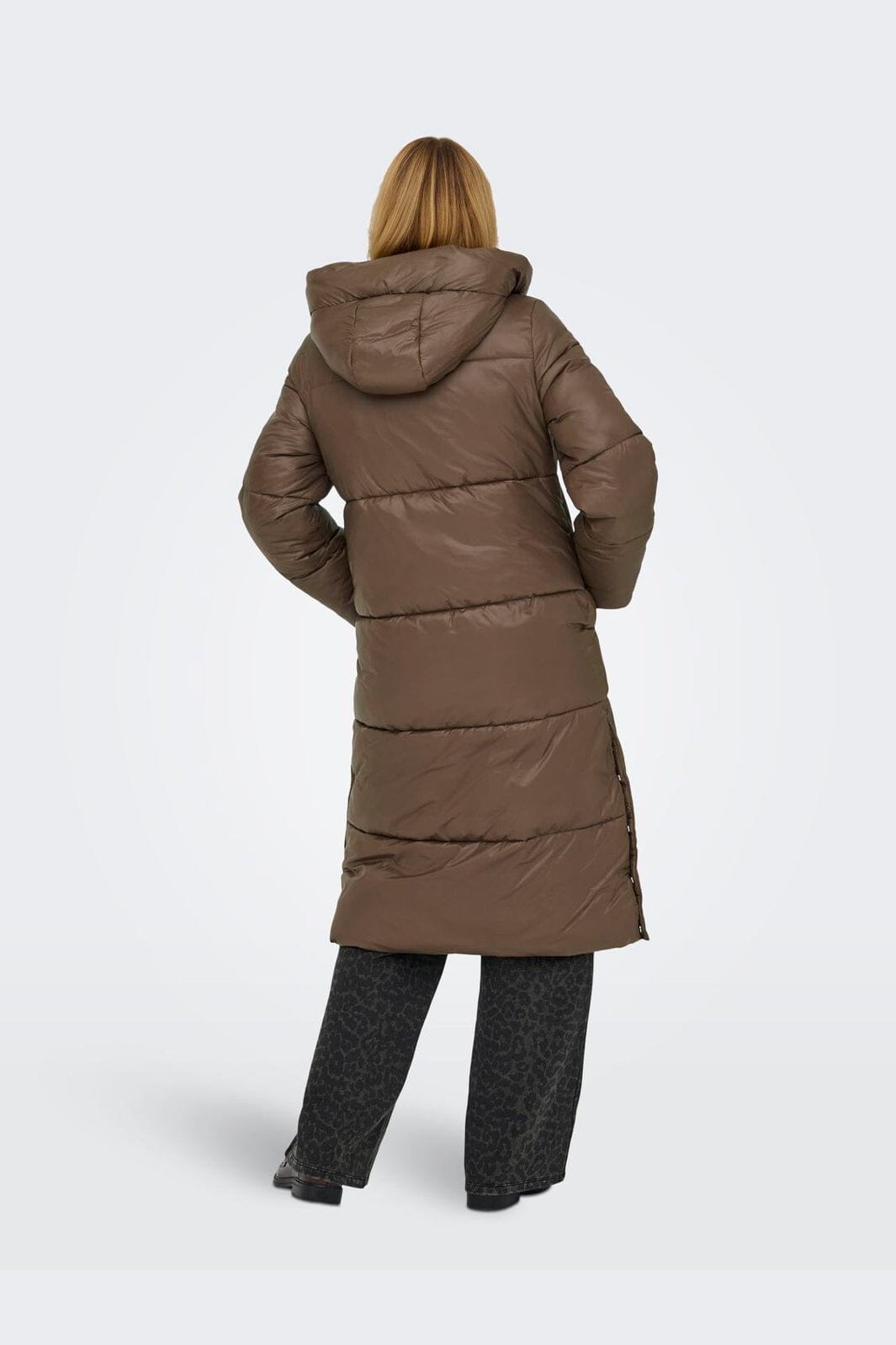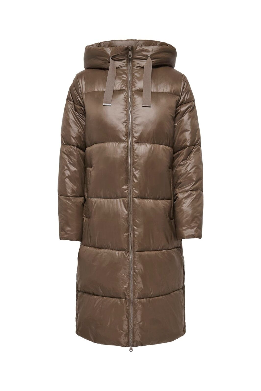 Pitkä puffer-takki Onlyltä ruskeassa värissä. Takki on valmistettu 100 % nailonista ja siinä on huppu, jossa on naru.
