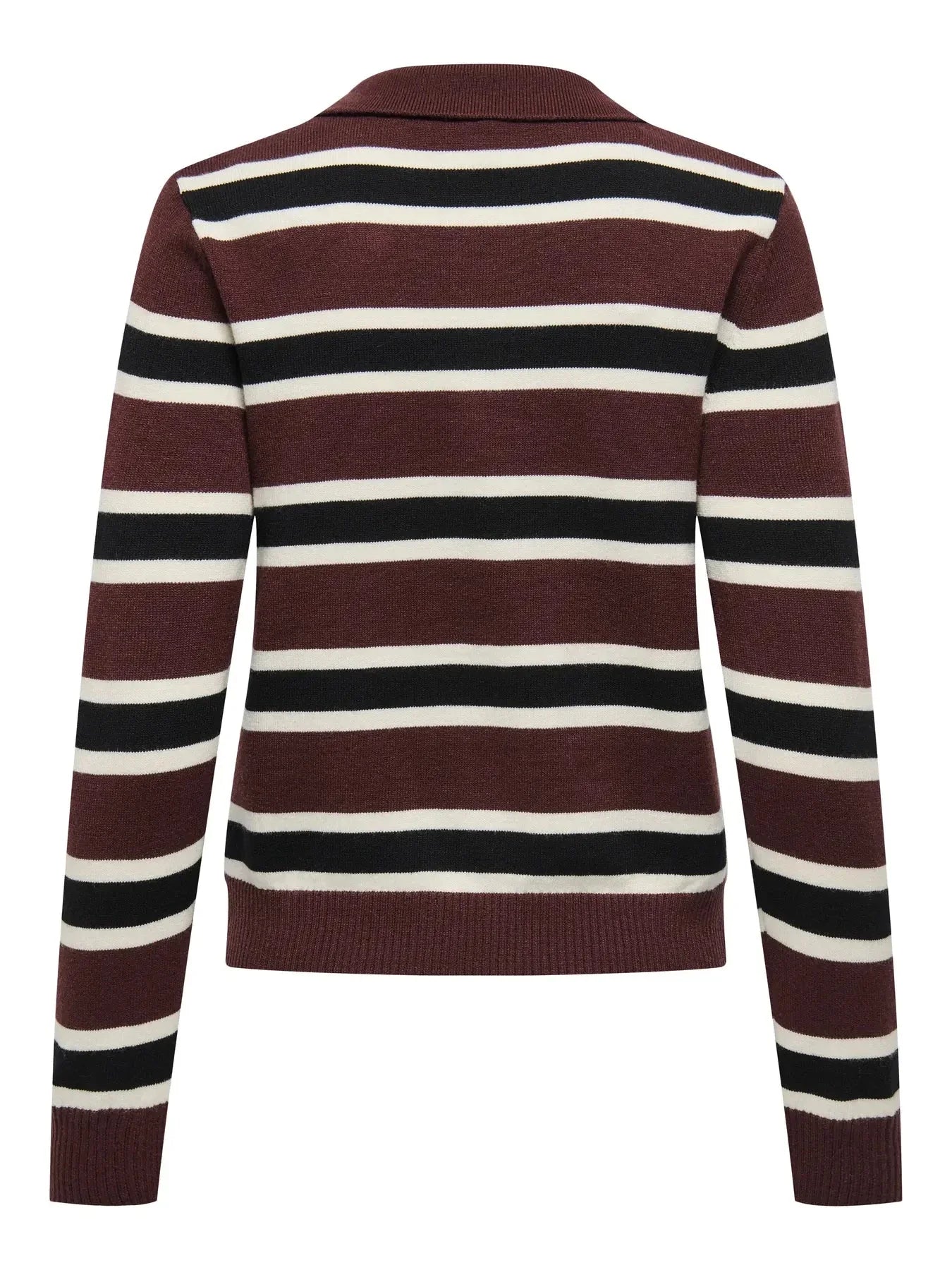 Raidallinen polo-neule Onlylta ruskeissa ja bordeaux-väreissä mustilla ja valkoisilla raidoilla. Neuleessa on polo-kaulus ja pitkät hihat.