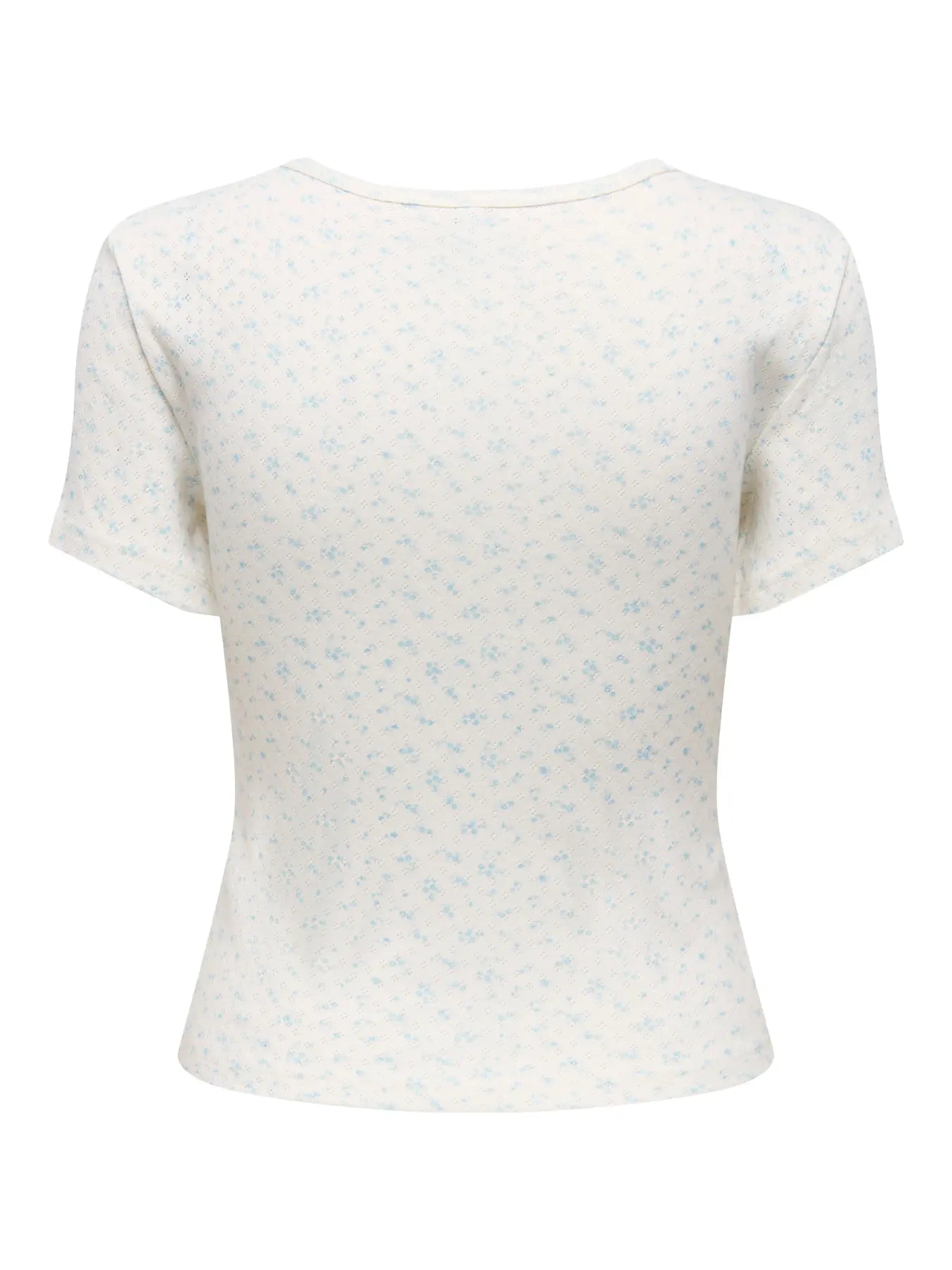 Baby-tee Onlylta valkoisena, jossa on pieniä vaaleansinisiä pilkkuja. T-paidassa on pyöreä pääntie ja lyhyet hihat.