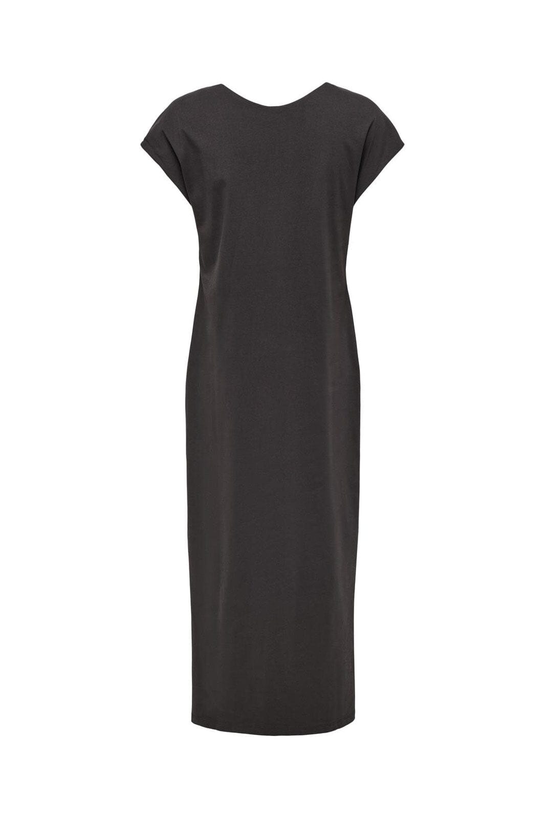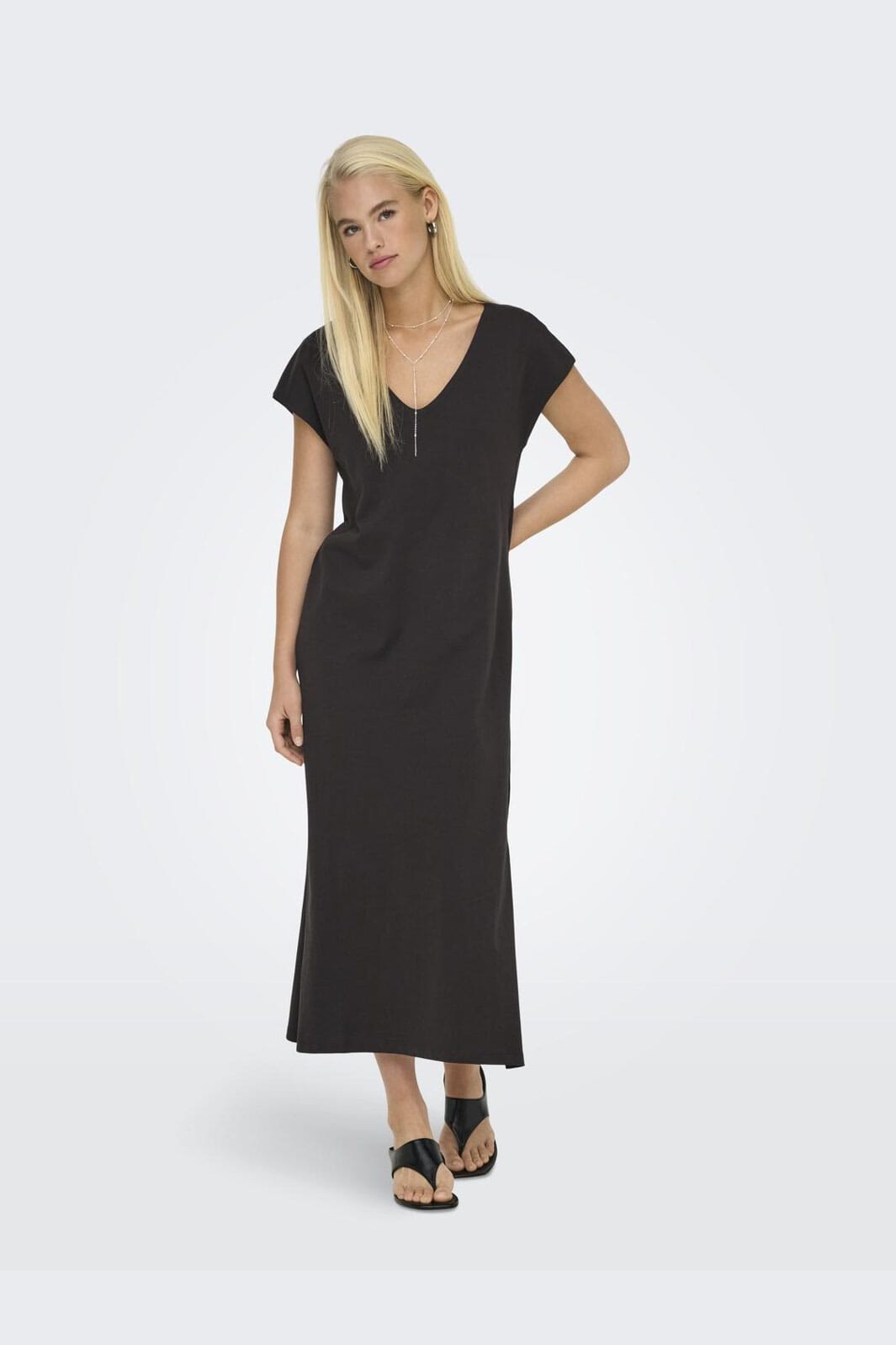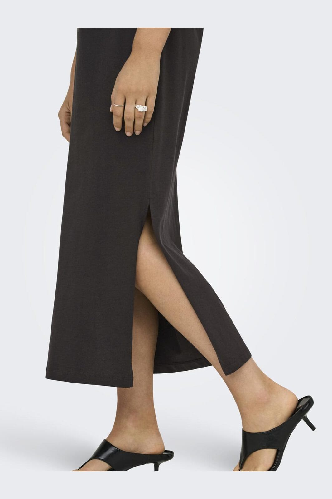 Onlyn mekko tummanruskeassa sävyssä. Siinä on V-pääntie ja lyhyet hihat, sekä suora malli, joka ulottuu nilkkoihin. Sivuhalkiot tarjoavat hyvää liikkuvuutta.