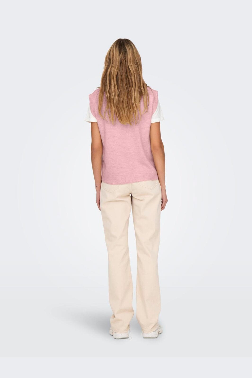 Hihaton neuleliivi Onlylta vaaleanpunaisena, kultaisen värisillä sydänkirjailuilla. Liivissä on pyöreä pääntie ja regular fit -mitoitus.