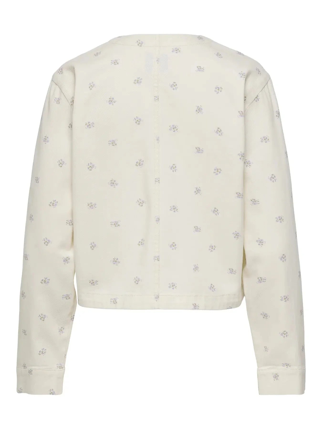Onlyn takki, joka on valmistettu 100 % puuvillasta ja jossa on kukkakuvio vaalealla offwhite-taustalla. Takissa on spread-kaulus ja se suljetaan näkyvillä napeilla.
