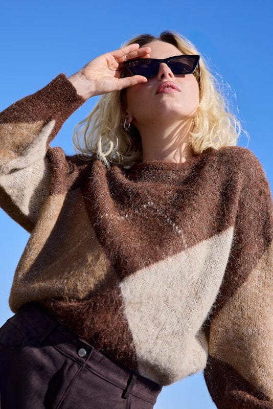 Onlyn neulepaita, jossa on argyle-kuvio ruskeissa ja beigen sävyissä. Paidassa on pyöreä kaula-aukko ja pitkät hihat.