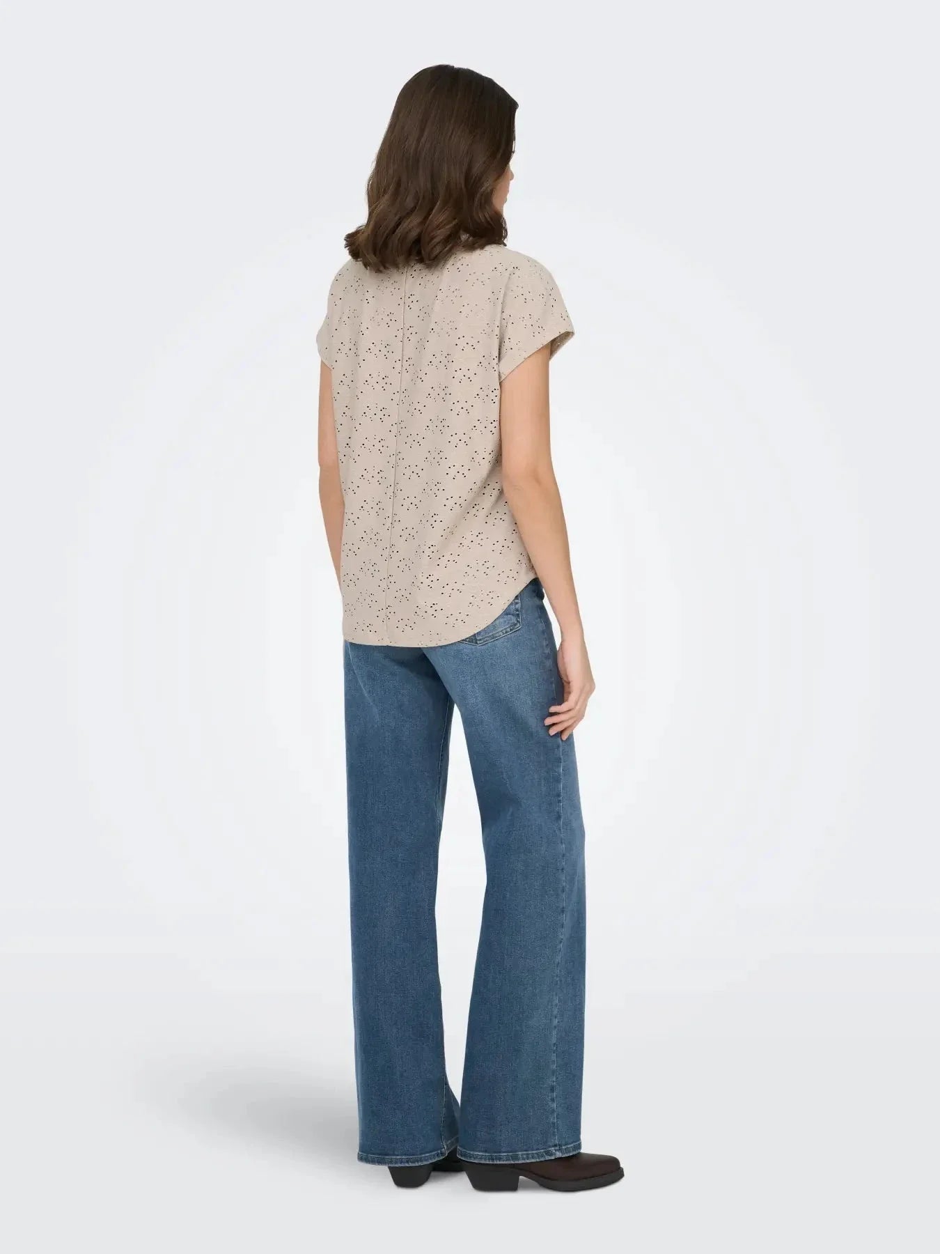 Harmaa Only-toppi, jossa on pitsiyksityiskohtia ja kirjailua. Toppi on yksivärinen beigeharmaa ja siinä on lyhyet käänteelliset hihat.