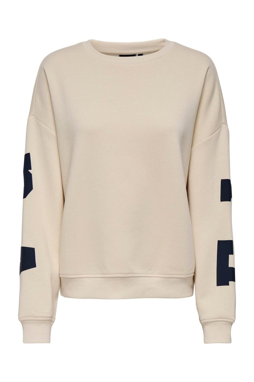 Onlyn collegepaita vaaleanbeigessä sävyssä, tummansinisellä printillä hihoissa ja selässä. Collegepaidassa on pyöreä pääntie ja pitkät hihat.