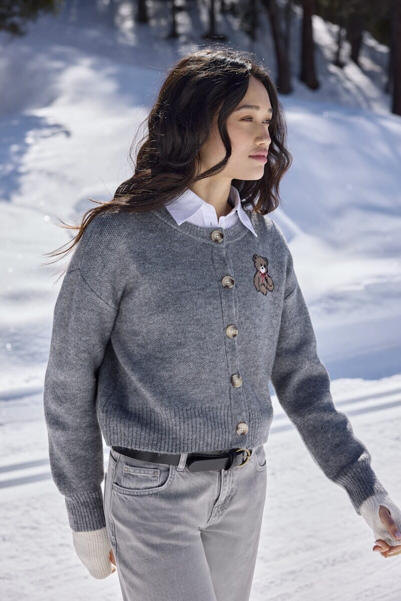 Harmaa cardigan Onlyltä teddy-yksityiskohdilla. Cardiganissa on löysä malli, jossa on ribbireunat hihoissa ja alareunassa.