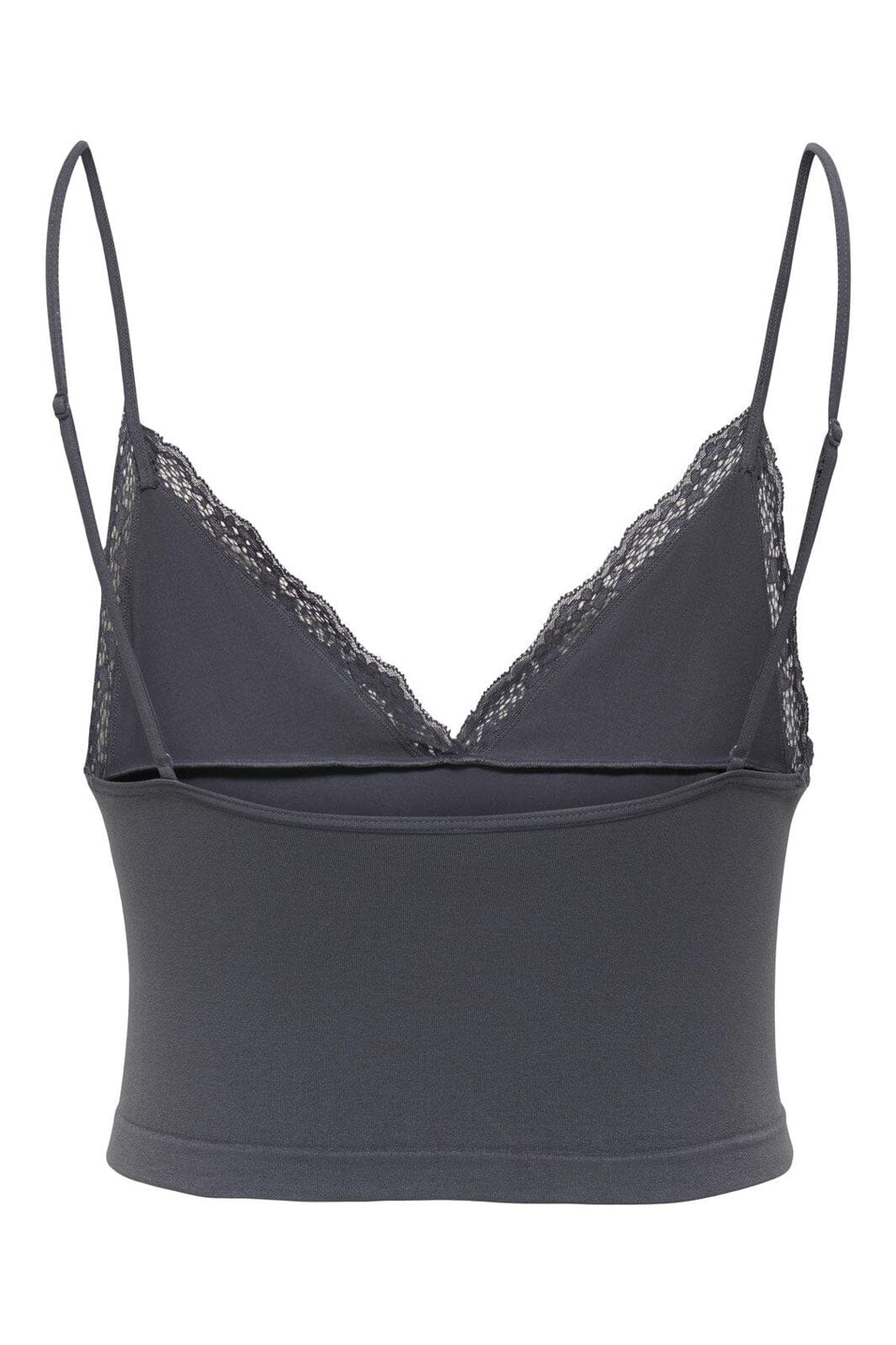 Harmaa toppi Onlyltä, jossa on pitsiyksityiskohtia V-pääntien ympärillä. Topilla on tiukka istuvuus ja kapeat olkaimet, jotka antavat sileän siluetin vaatteiden alla.