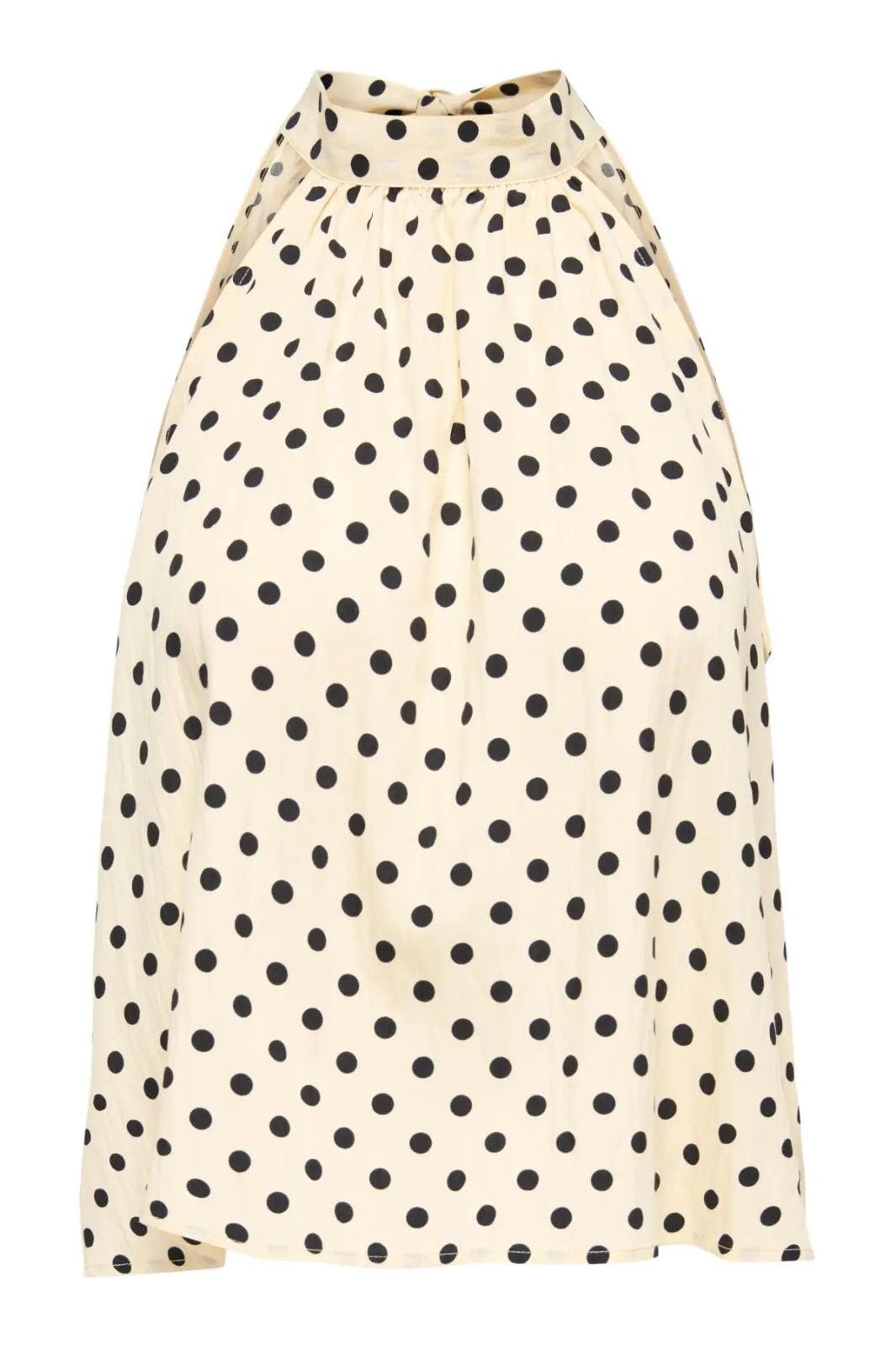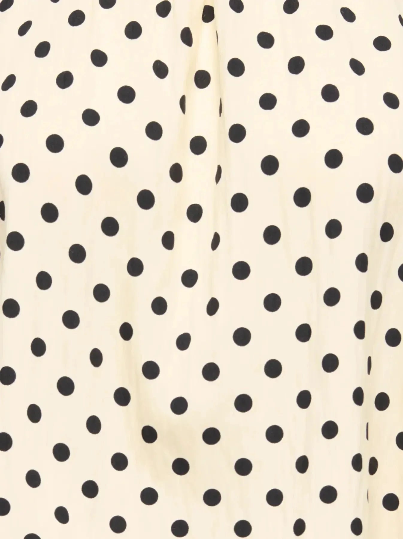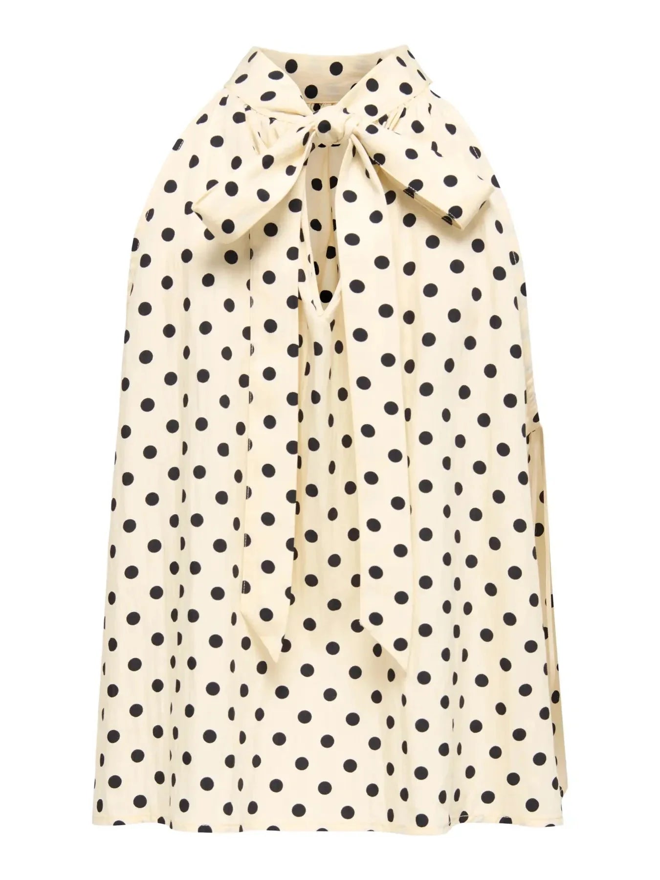 Hihaton toppi Onlylta, jossa on pilkkukuvio. Mustat pilkut hiekanvärisellä taustalla luovat klassisen ilmeen vahvalla kontrastilla.