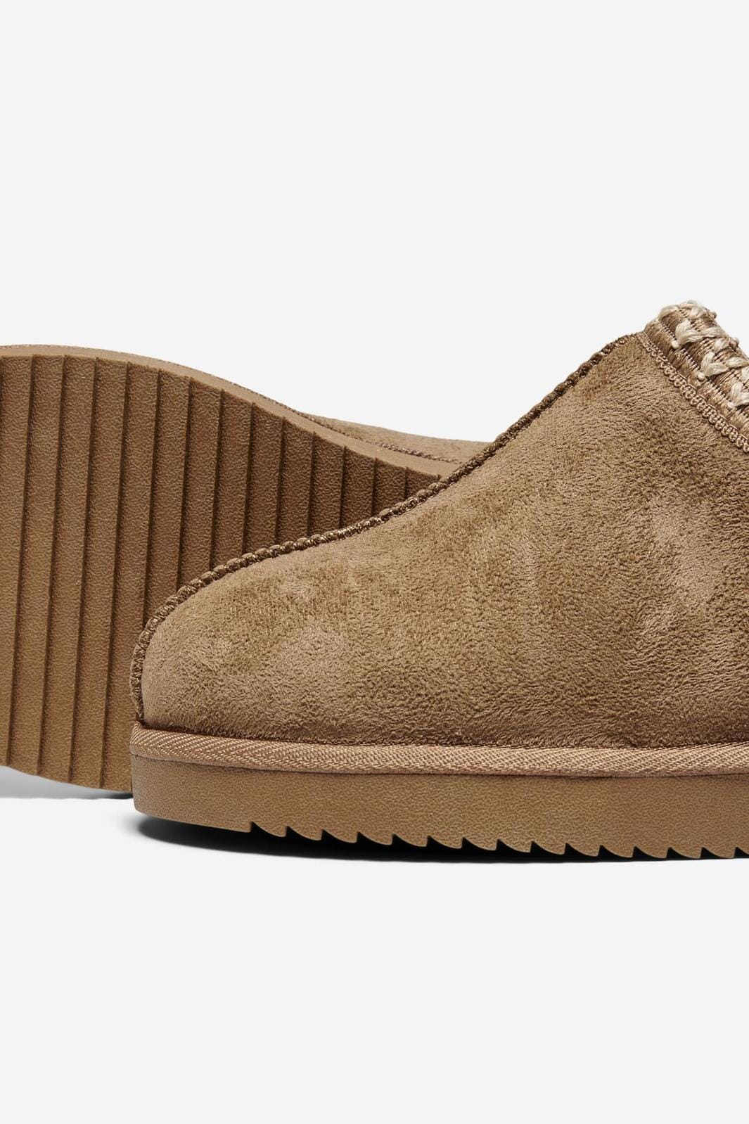 Kotitossut Onlyltä, väri cognac, synteettistä mokkaa. Pehmeässä kengässä on lämmin teddyvuori ja koristeelliset saumat reunan ympärillä.