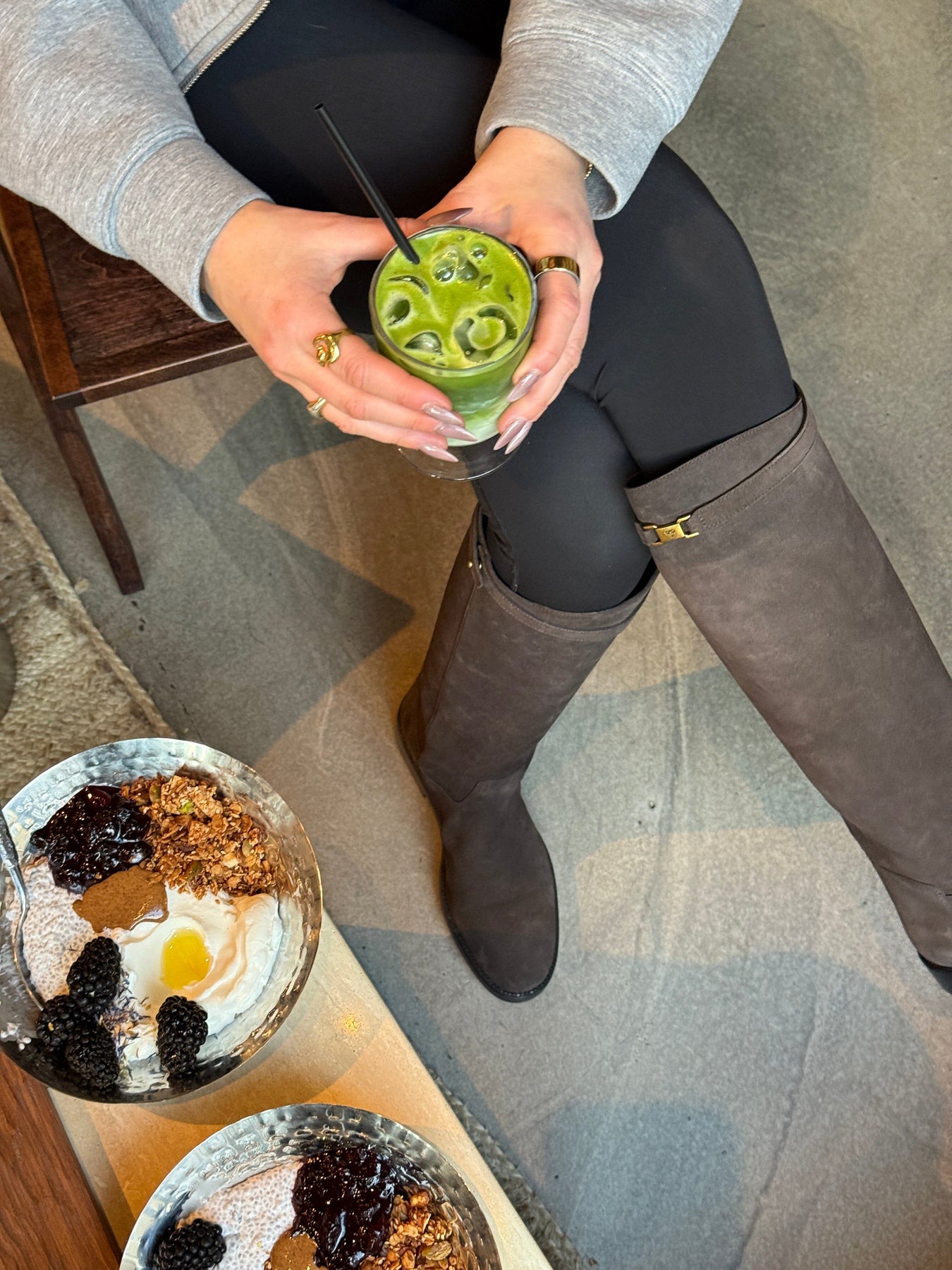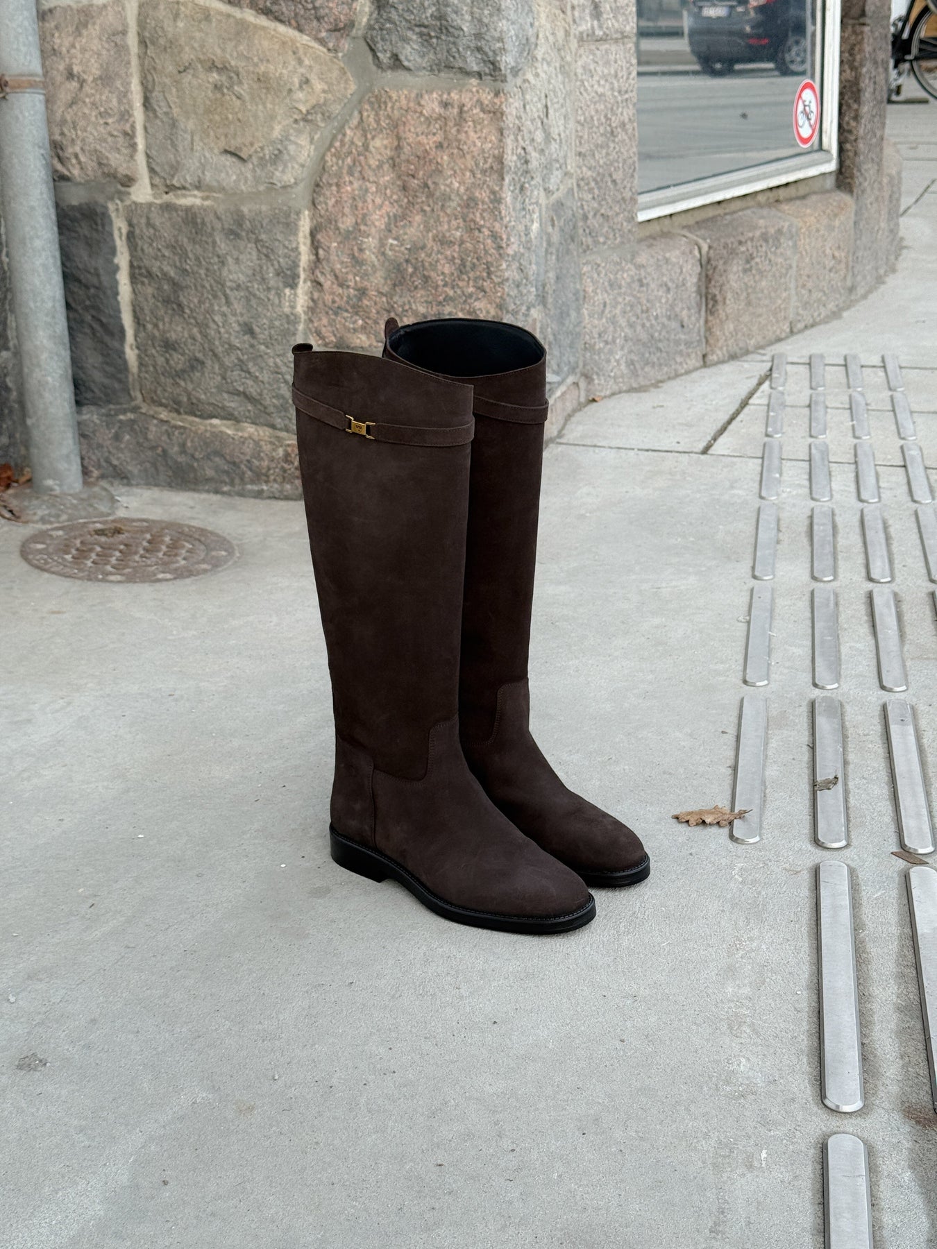 Polvipituiset saappaat Phenumb Copenhagenilta, valmistettu mokasta tummanruskeassa sävyssä. Saappaissa on litteä musta pohja ja pieni kullanvärinen solki ylhäällä.