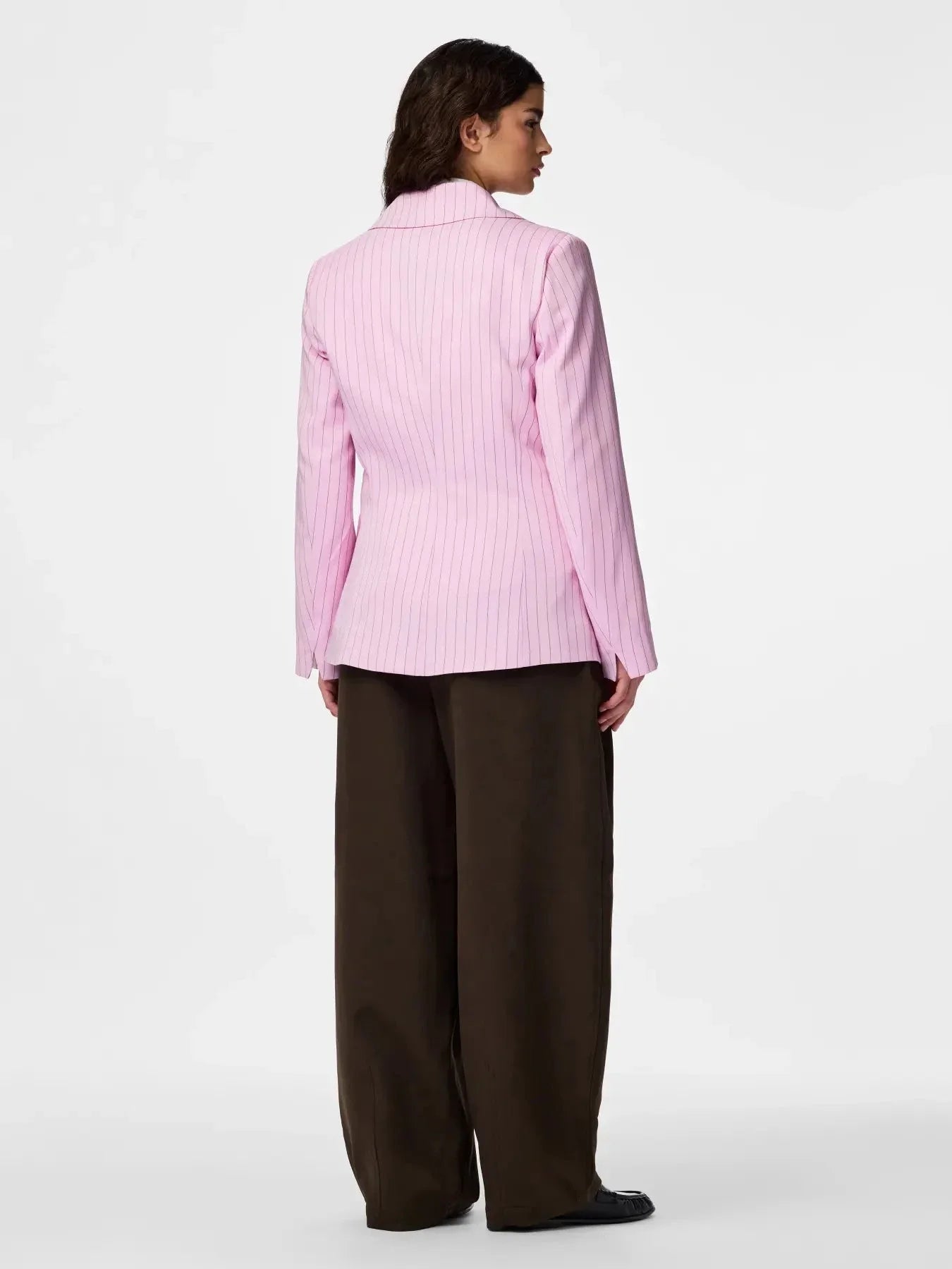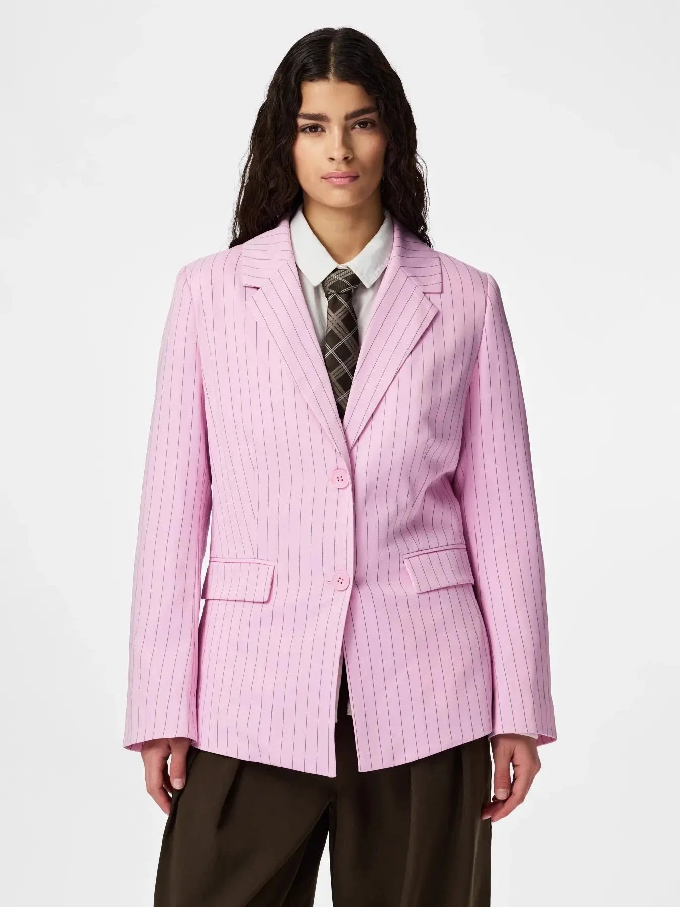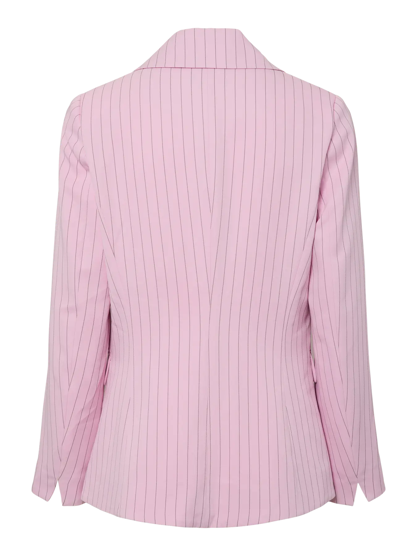Vaaleanpunainen Pieces-bleiseri, jossa on ohuet vaaleanpunaiset raidat koko pinnalla. Valmistettu polyesteristä ja elastaanista, silkkimäisellä pinnalla.