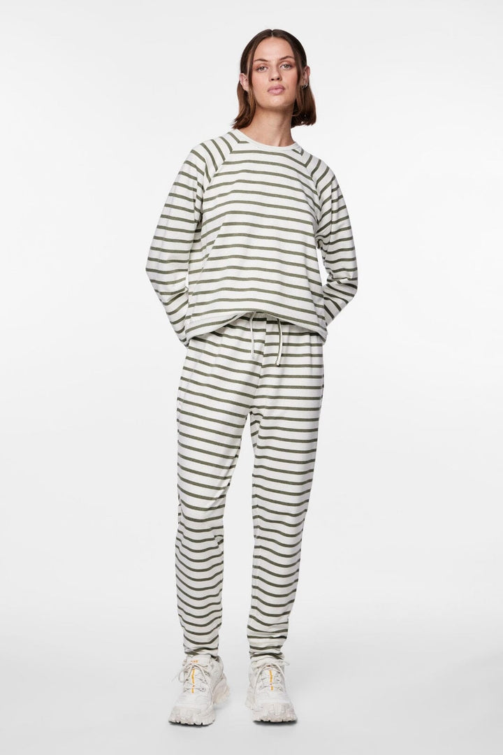 Raidalliset housut Piecesiltä vihreänä ja valkoisena. Housuissa on rento malli, jossa on joustava vyötärö ja säätönyöri. Raidallinen kuvio antaa yksinkertaisen ja tyylikkään ilmeen.