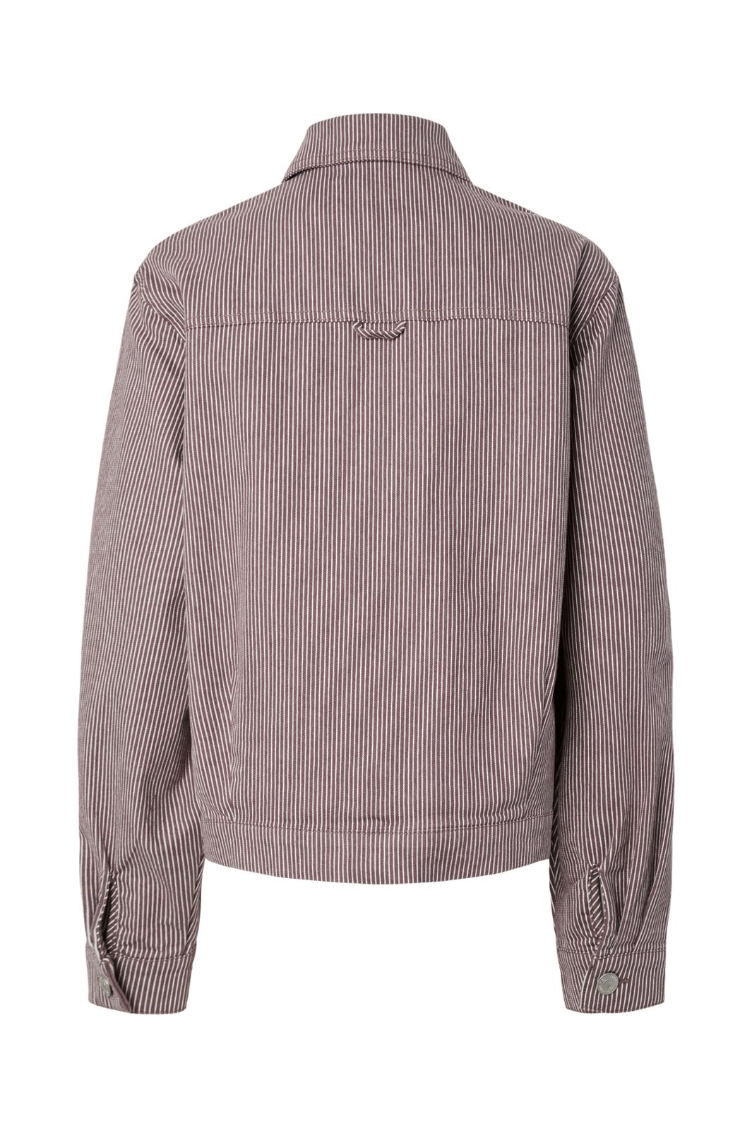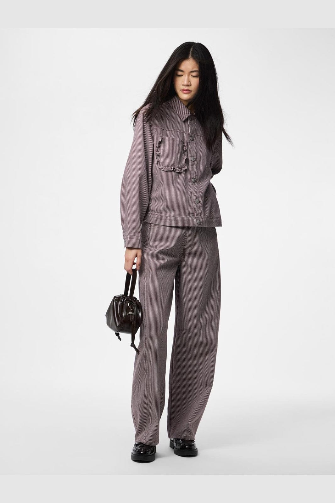 Raidallinen farkkutakki Piecesiltä ruskeanharmaissa sävyissä, joissa on valkoisia raitoja. Takissa on väljä istuvuus ja koristeelliset röyhelöt taskuissa.