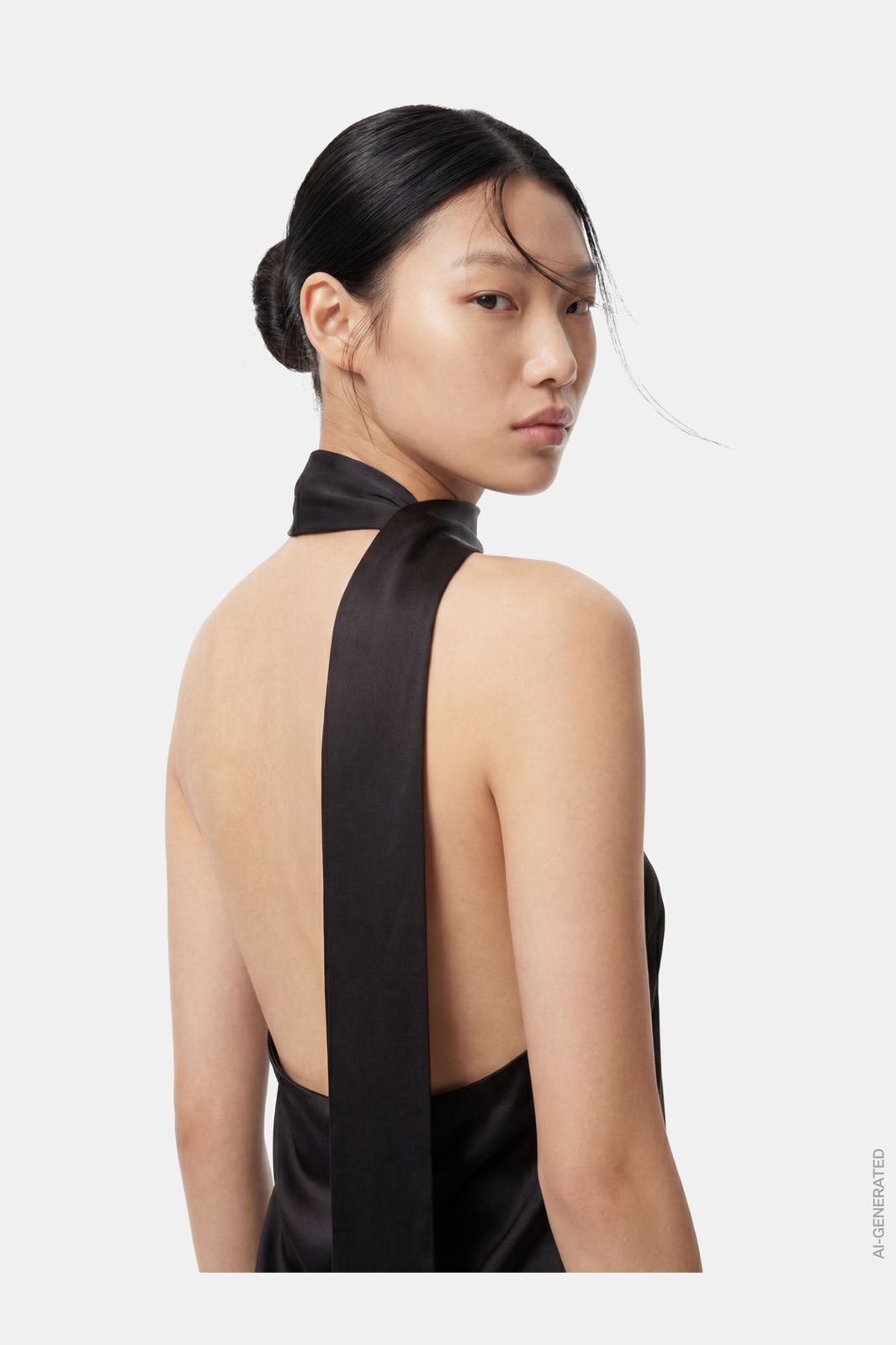 Musta satiinimekko Piecesiltä, jossa on epäsymmetrinen malli ja solmittava nauha kaulalla. Mekossa on sileä pinta ja se sopii sekä juhlaviiin että muodollisiin tilaisuuksiin.
