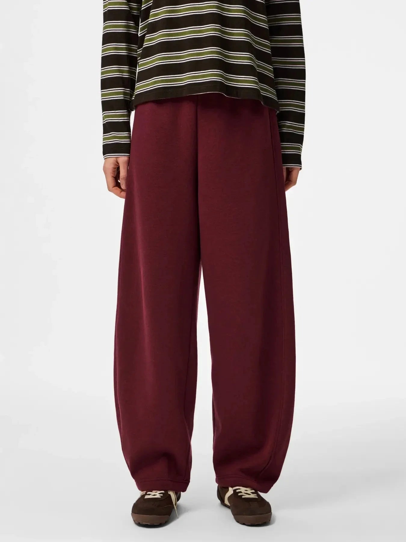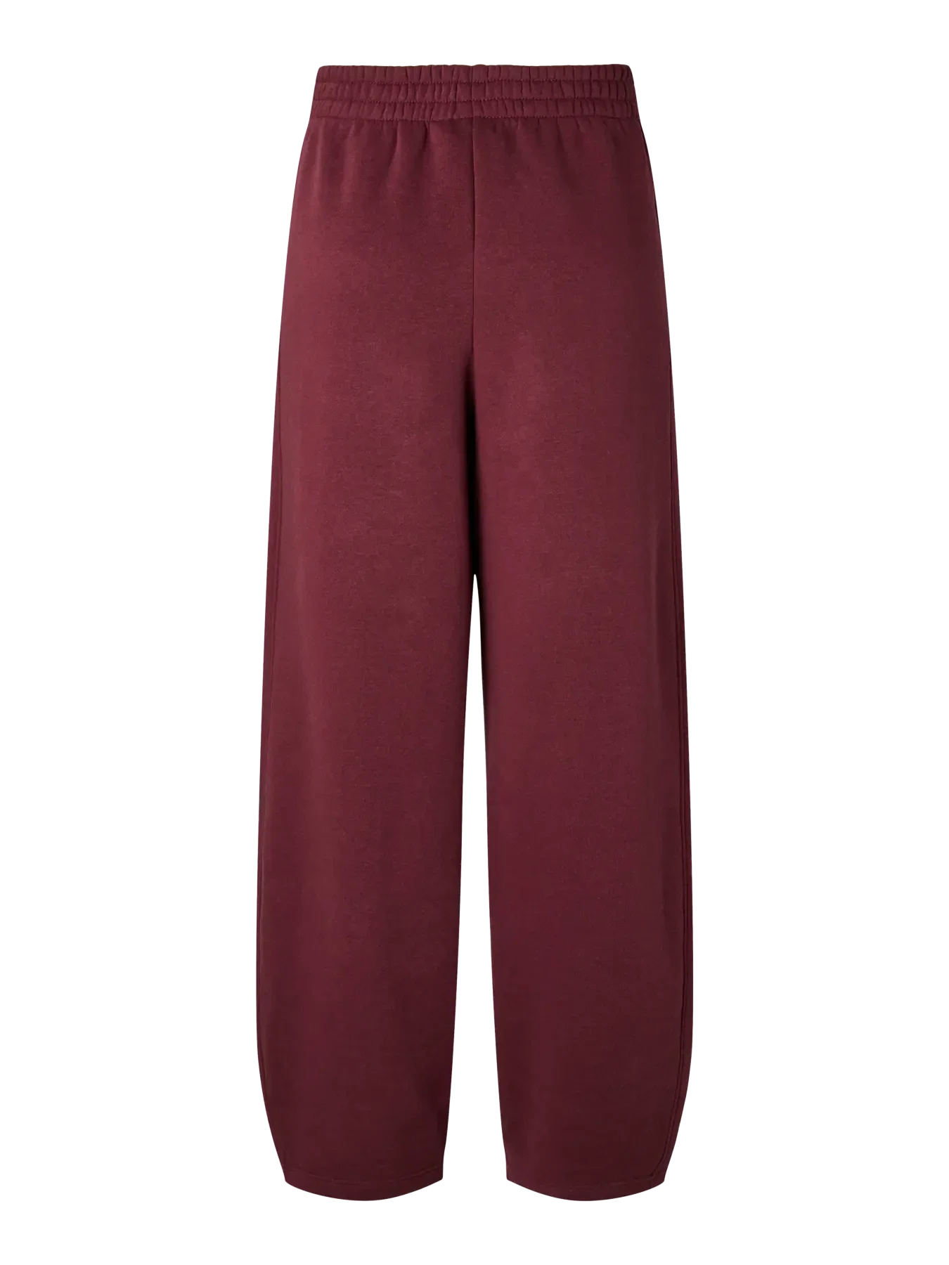 Barrel-housut Piecesiltä syvän punaruskeassa värissä. Housuissa on väljä istuvuus, leveälahkeinen malli ja joustava vyötärö.