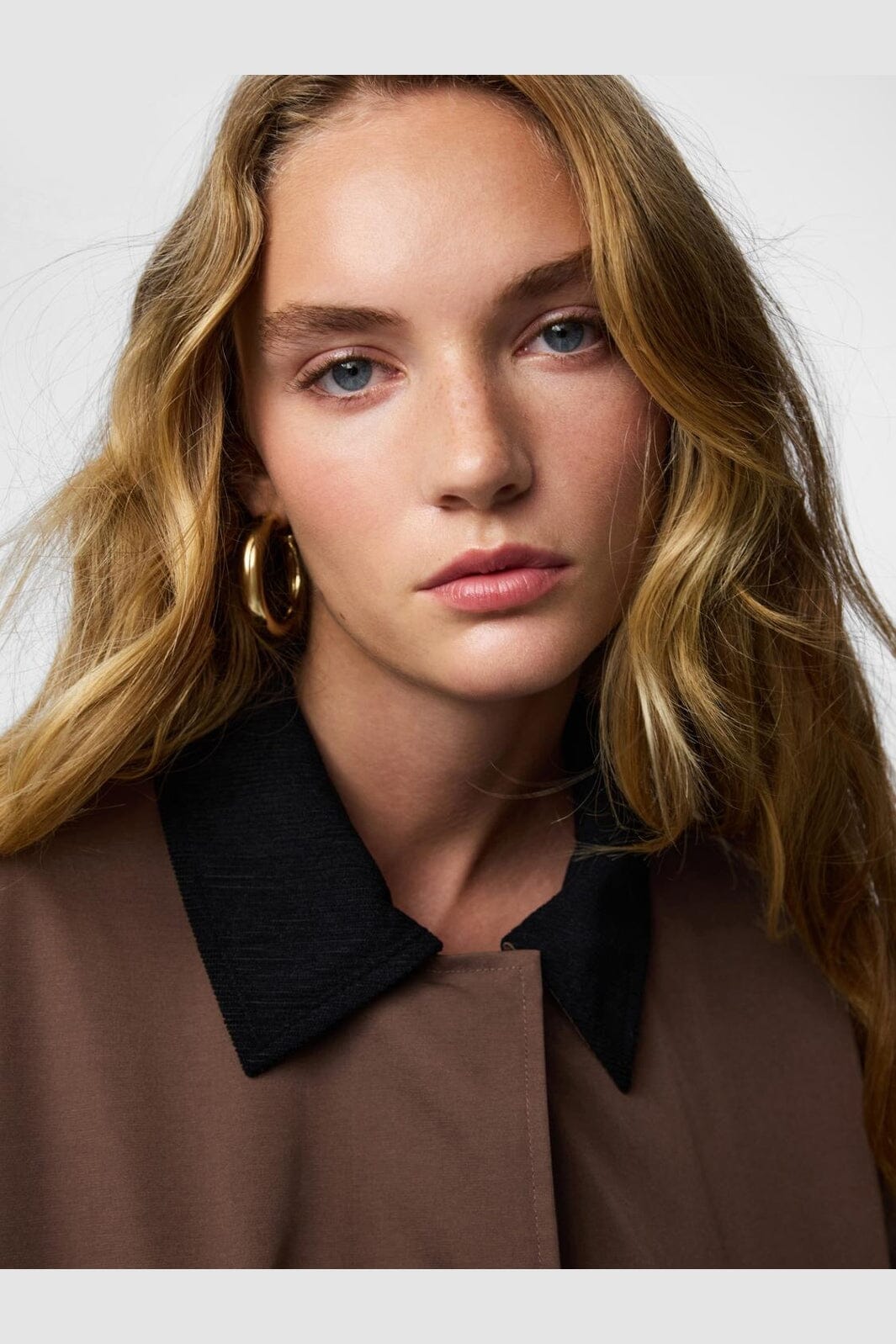 Lyhyt takki Piecesiltä, valmistettu polyesteristä, jossa on silkkimäinen pinta. Takki on ruskea mustalla kauluksella ja mustilla hihansuilla.