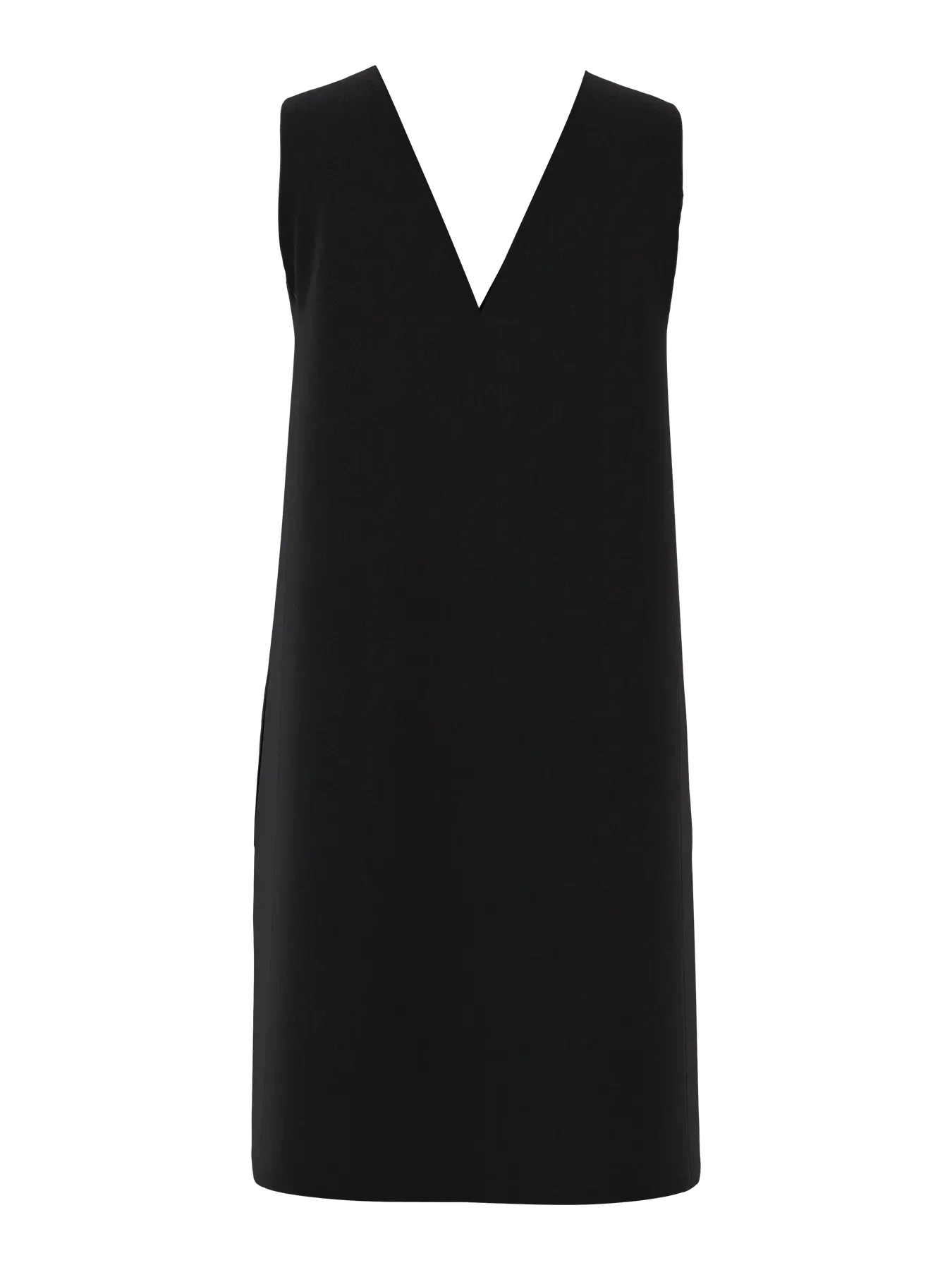 Musta spencer-mekko Piecesiltä V-pääntiellä edessä ja takana. Olkaimeton mekko on löysästi istuva ja ulottuu polveen.