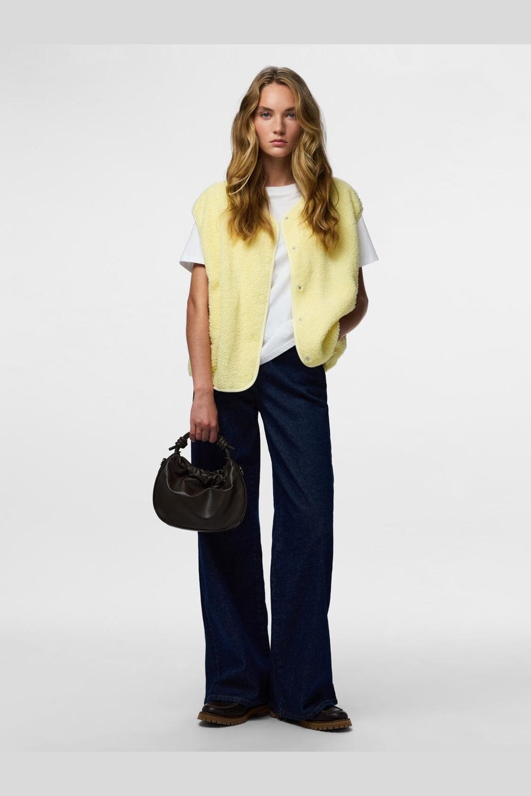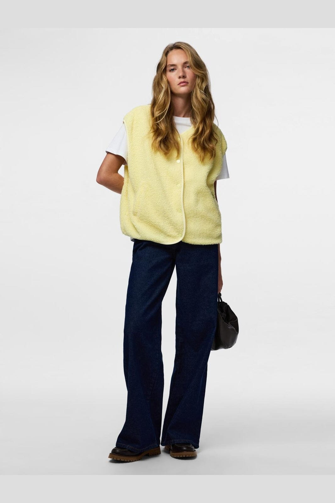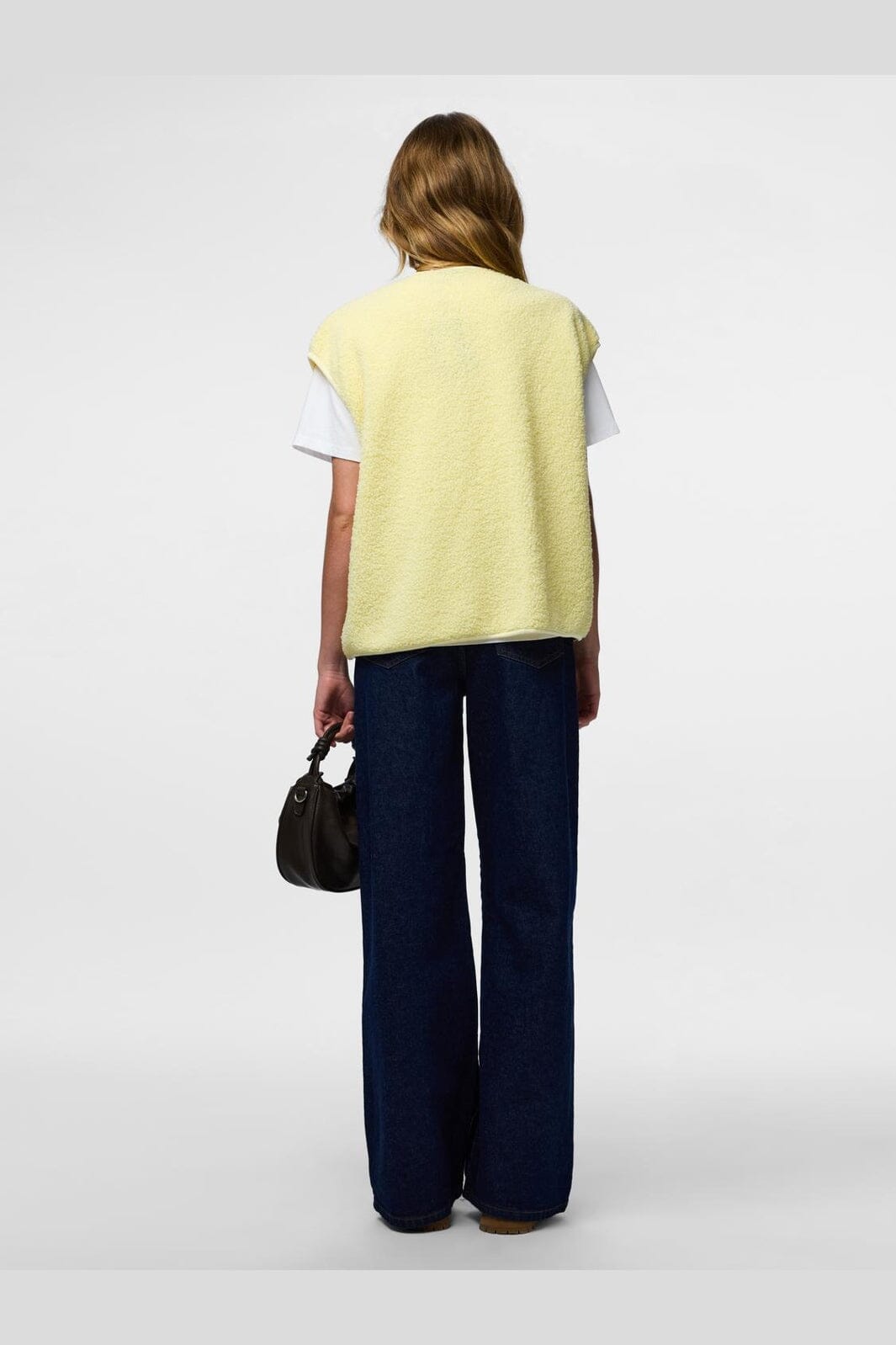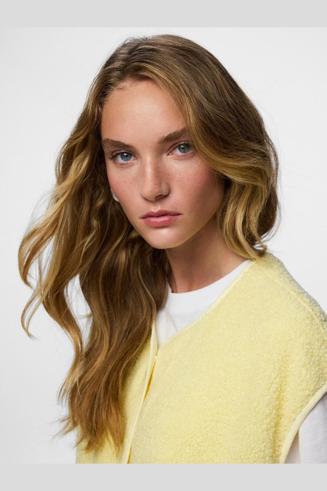 Hihaton teddyliivi Piecesiltä värissä French Vanilla, vaaleankeltainen sävy. Liivissä on pehmeä pinta ja nepparikiinnitys.