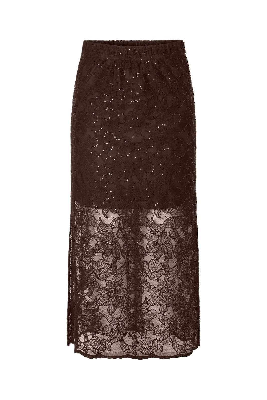 Pieces-merkin ruskea hame, jossa on pieniä, kiiltäviä paljetteja ja läpikuultava pitsireunus helmassa. Kukkakuvio antaa hameelle feminiinisen ilmeen.
