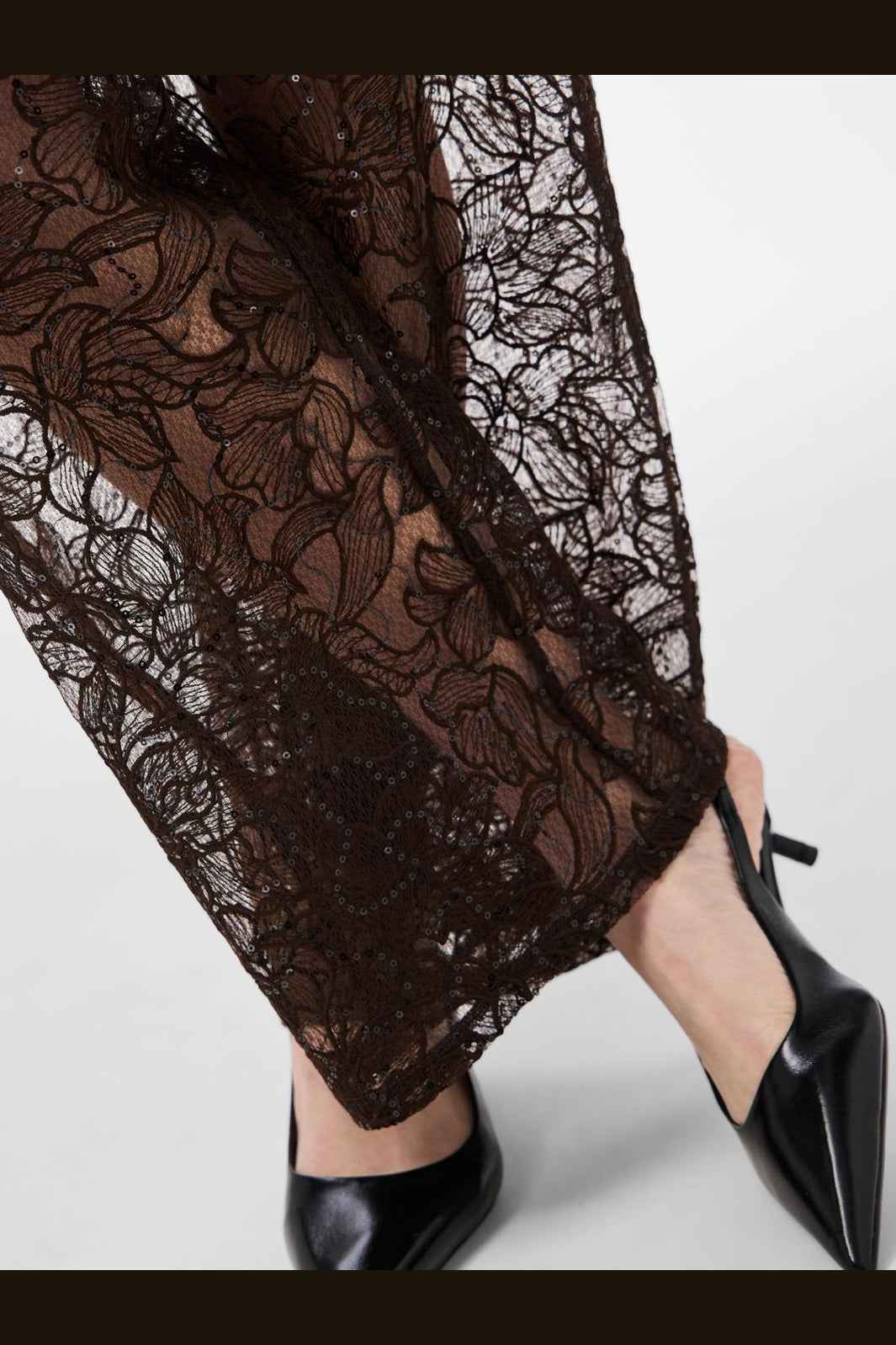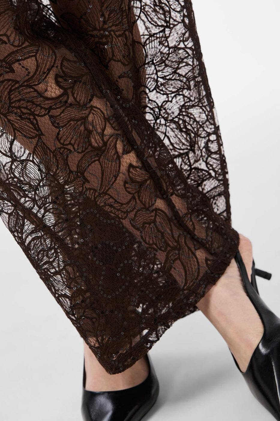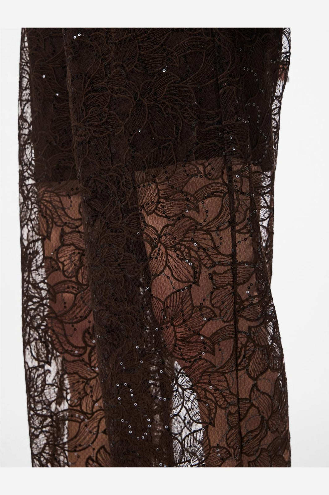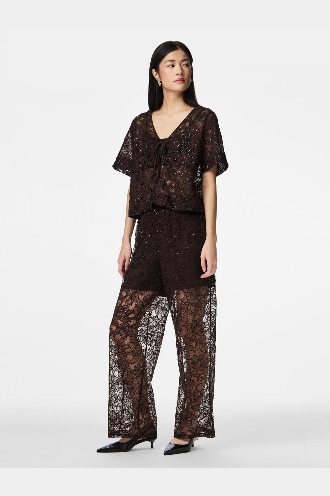 Suorat housut Piecesiltä, valmistettu läpikuultavasta pitsistä, jossa on kukkakuvio ja paljetteja tummanruskeassa sävyssä.