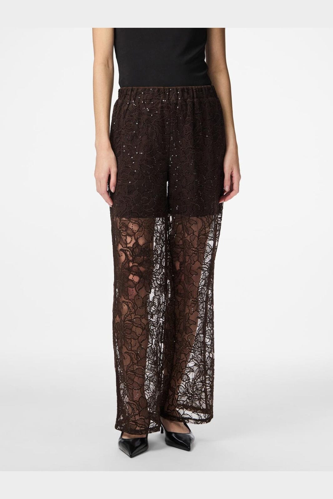 Suorat housut Piecesiltä, valmistettu läpikuultavasta pitsistä, jossa on kukkakuvio ja paljetteja tummanruskeassa sävyssä.