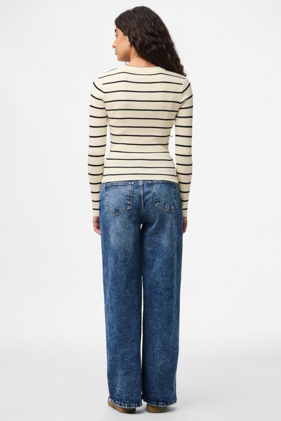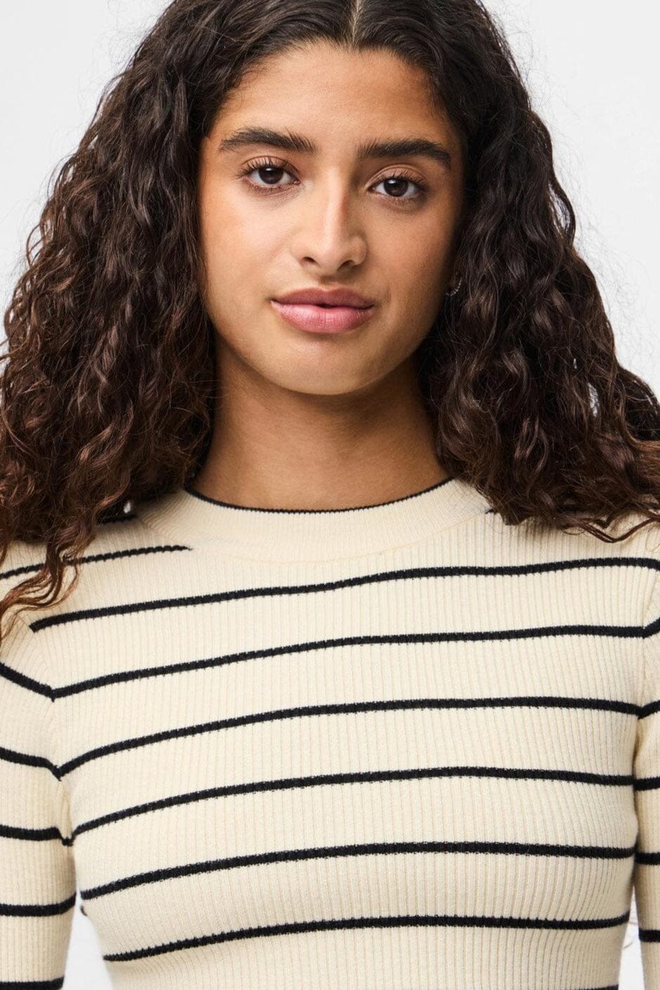 Raidallinen neulepaita Piecesilta, jossa on pyöreä kaula-aukko. Vaalea koivunväri sisältää kapeita mustia raitoja, ja neuleella on tiukka istuvuus ribbitekstuurilla.