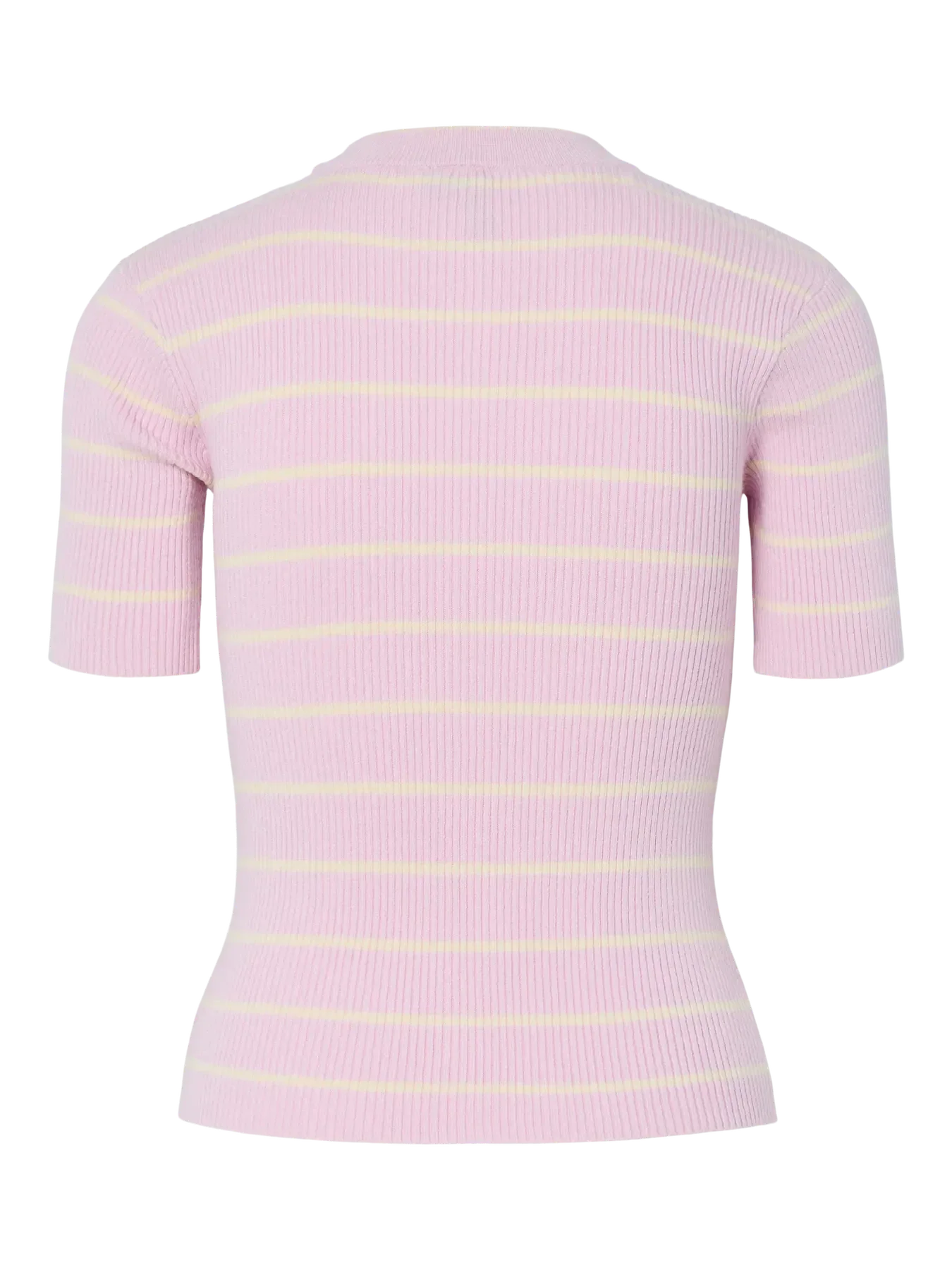 Neulepaita Piecesiltä vaaleanliilana vaaleanpunaisilla raidoilla. Paidassa on lyhyet hihat, pyöreä pääntie ja vartaloa myötäilevä istuvuus.