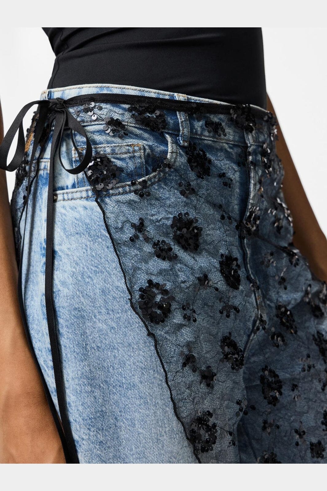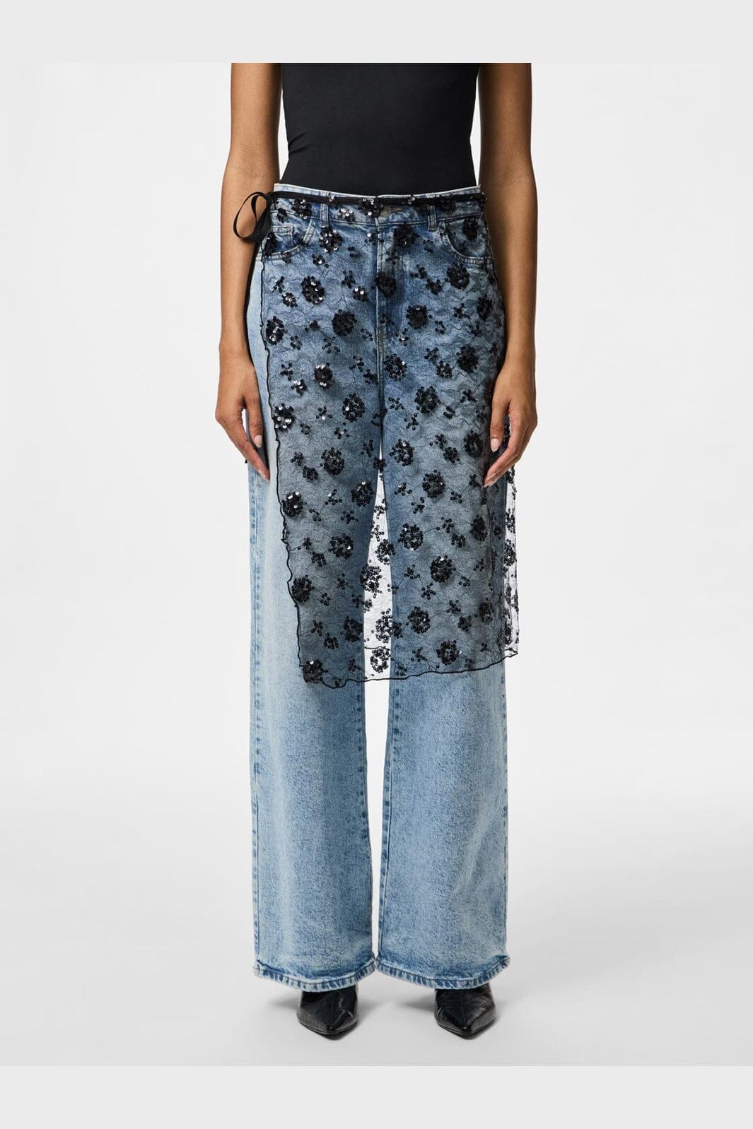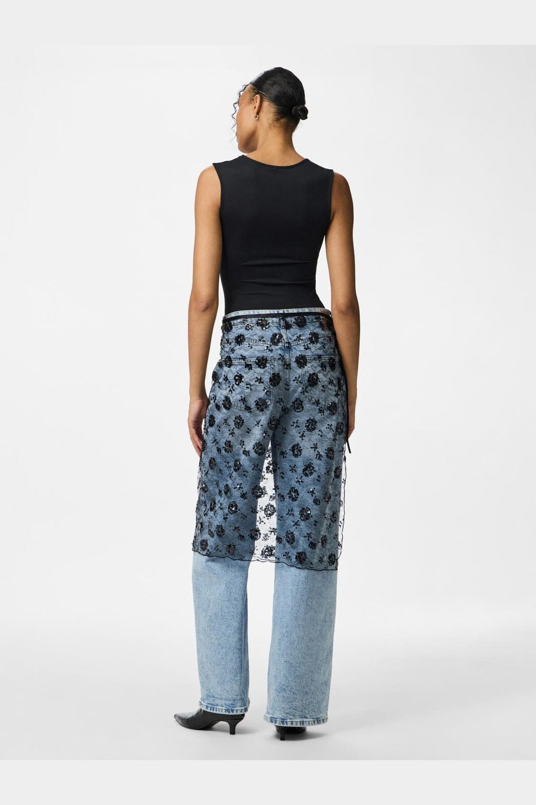 Musta sarong Piecesilta, valmistettu läpinäkyvästä pitsistä, jossa on kukkakuosi. Sarongissa on mustia paljetteja ja vyötäröllä nauha.