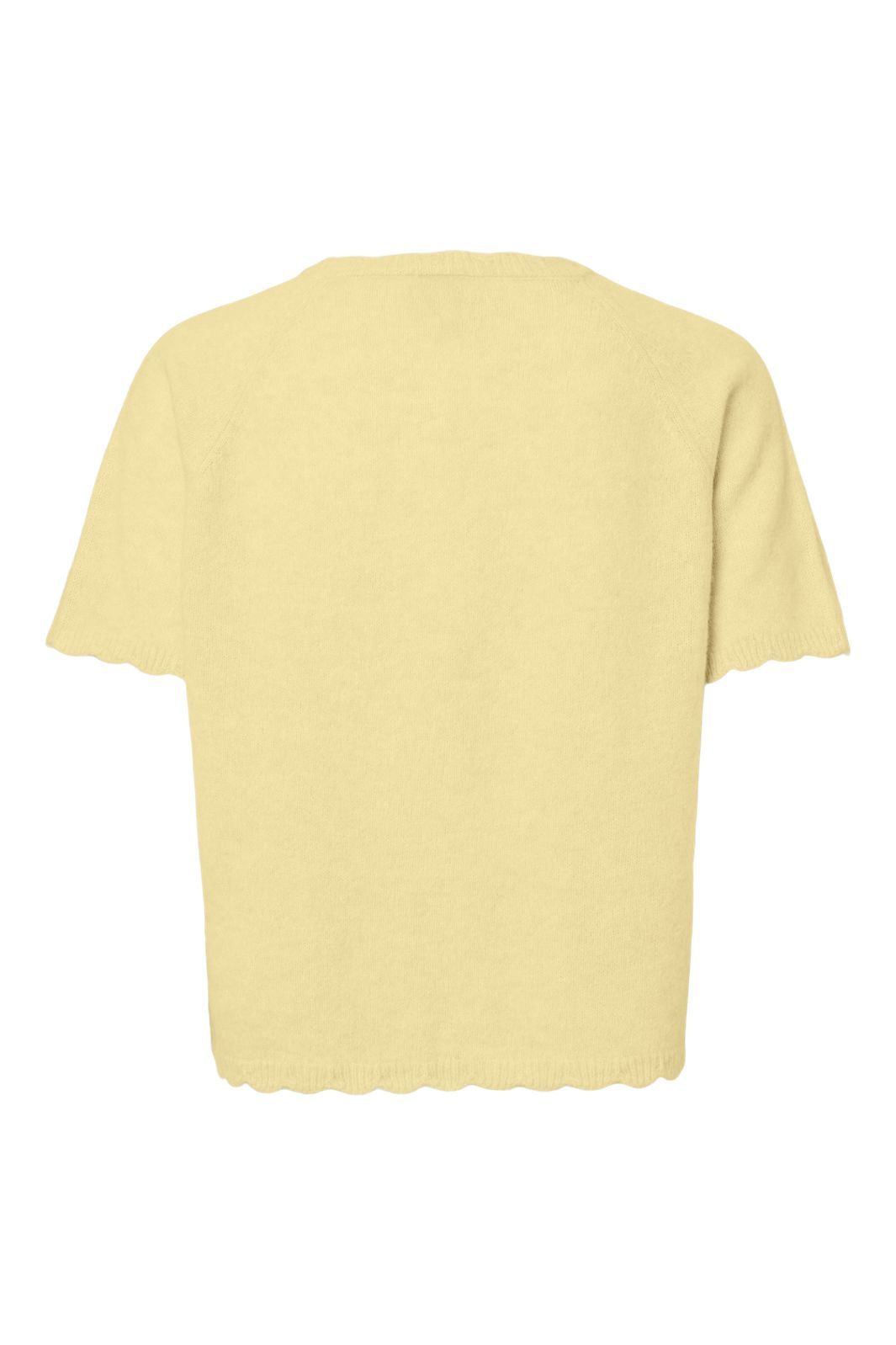 Lyhythihainen cardigan Piecesiltä värissä French Vanilla, jossa on pyöreä kaula-aukko. Neulottu muotoilu aaltoilevilla reunoilla ja koristeompeleilla reunan varrella.