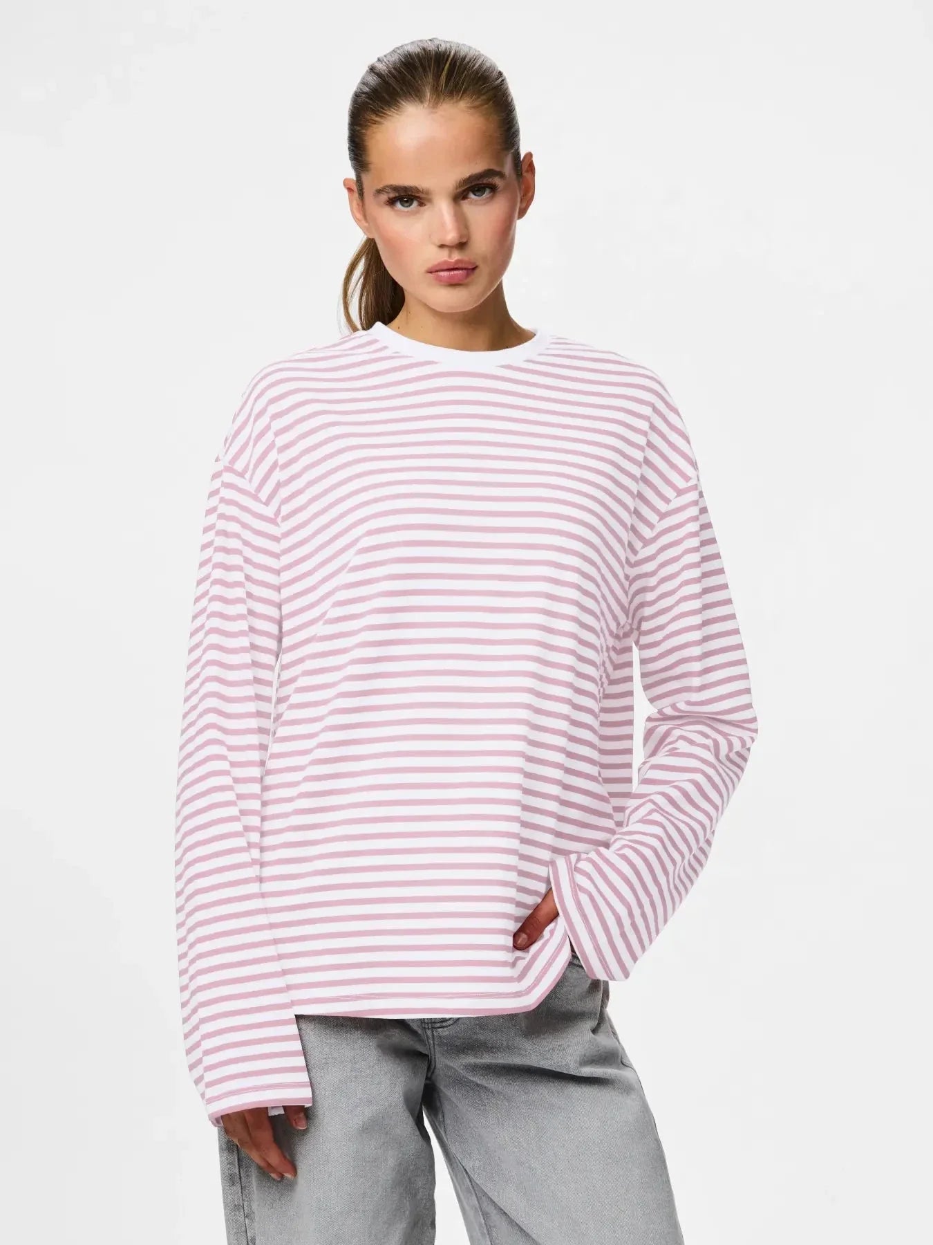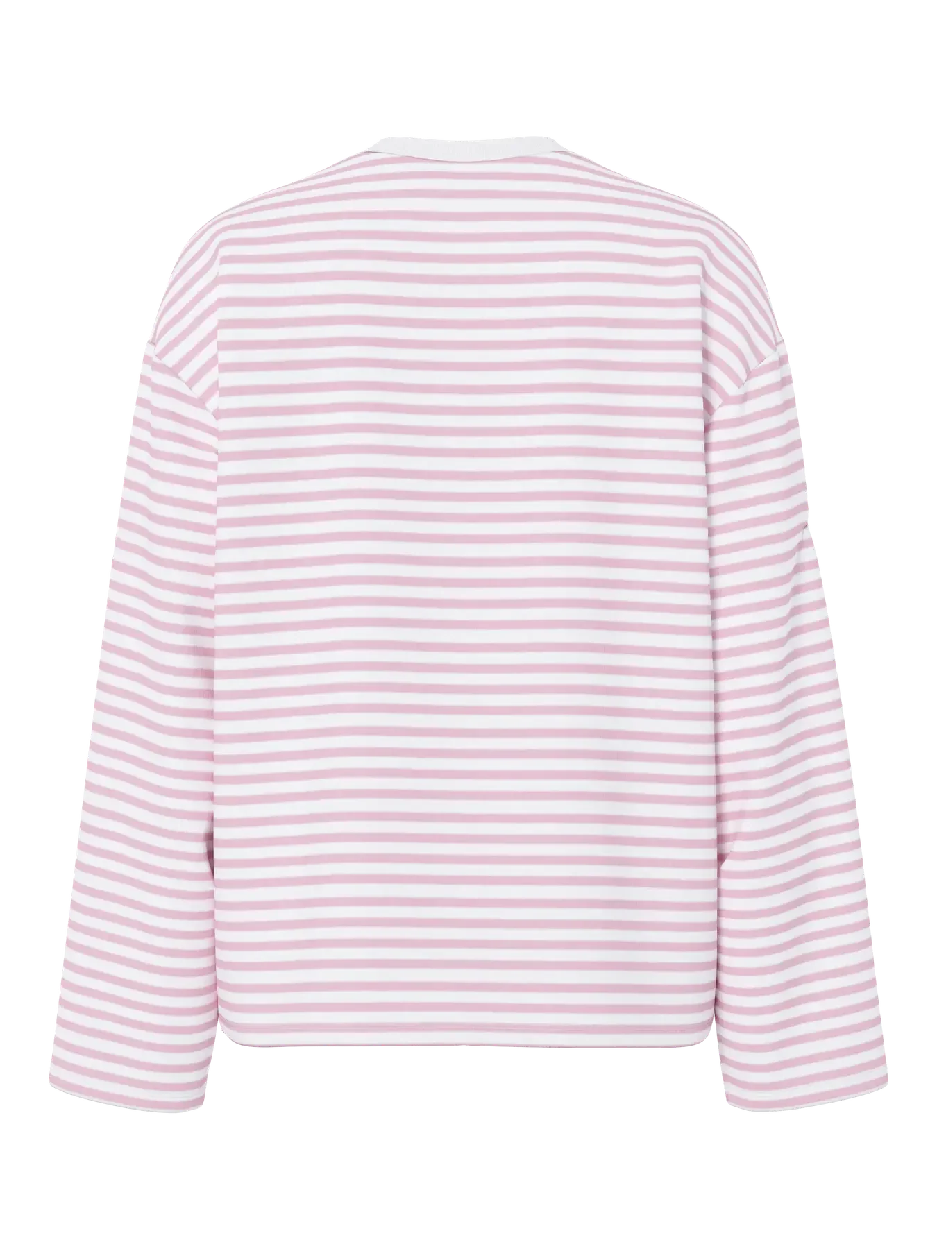 Pitkähihaisen Pieces-paidan raidat ovat valkoiset ja vaaleanpunaiset. Valmistettu 75 % puuvillasta ja 25 % polyesteristä.