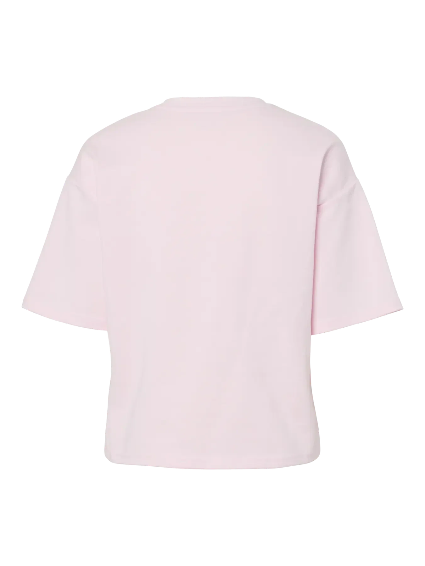 Vaaleanpunainen Piecesin T-paita, jossa on pyöreä pääntie ja lyhyet hihat. T-paidassa on regular fit -mitoitus ja laskettu olkasauma.