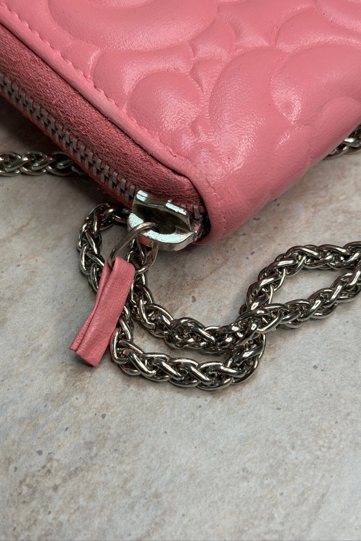 Vaaleanpunainen Chanel-lompakko kukkakuviolla ja ketjuhihnalla. Tuote on Preloved Vintageline x Molly&My -mallistosta ja on hyvässä, mutta käytetyssä kunnossa.