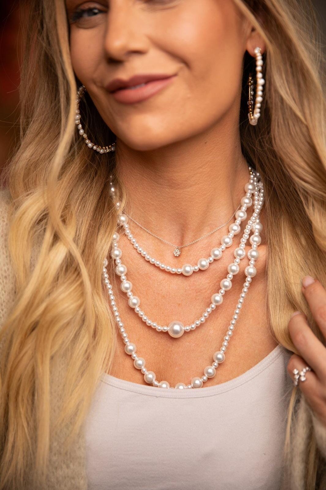 Rootedin 3 helmikaulakorun setti, jossa on valkoisia helmiä eri kokoisina ja kullanvärinen viimeistely.
