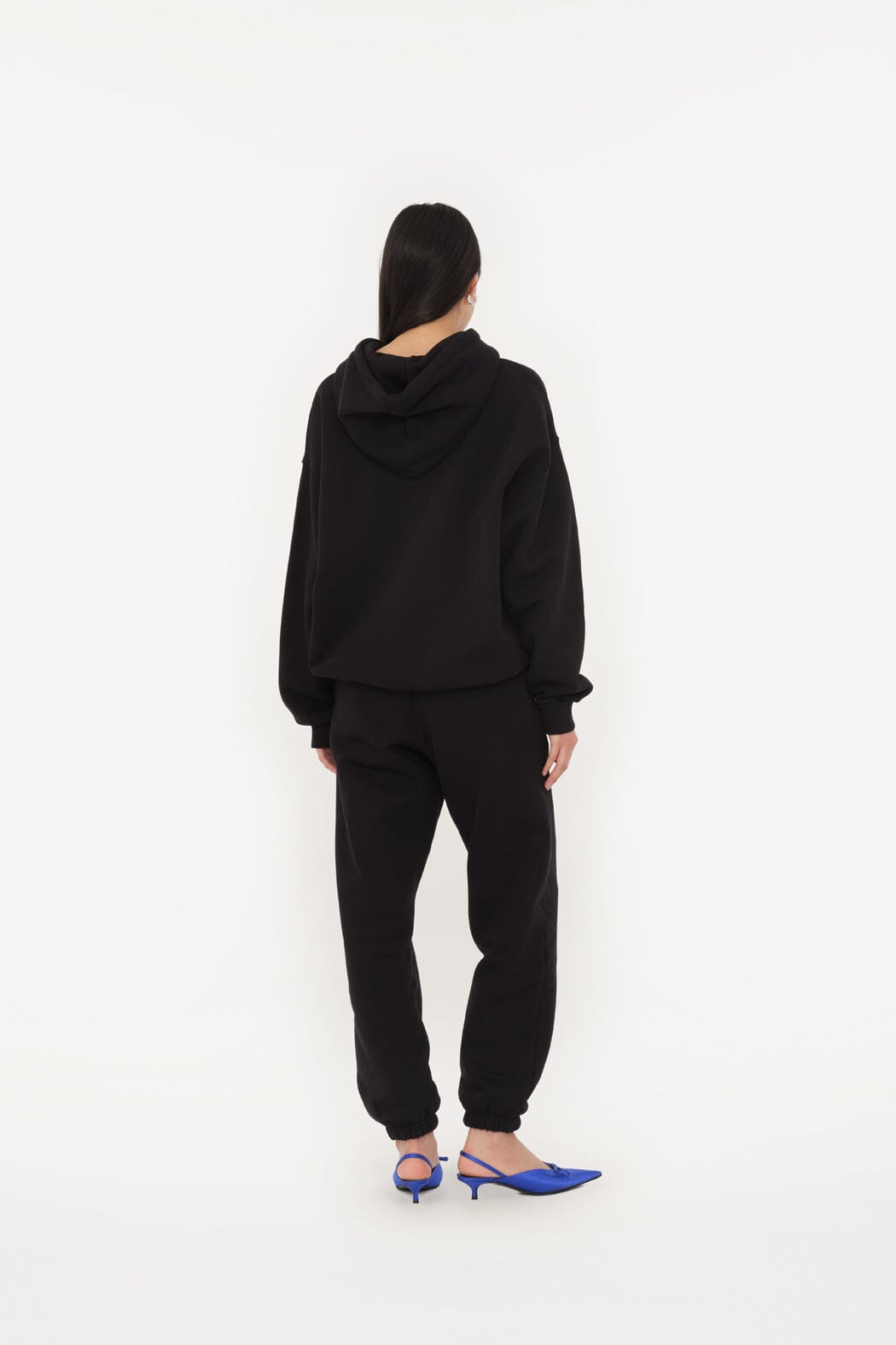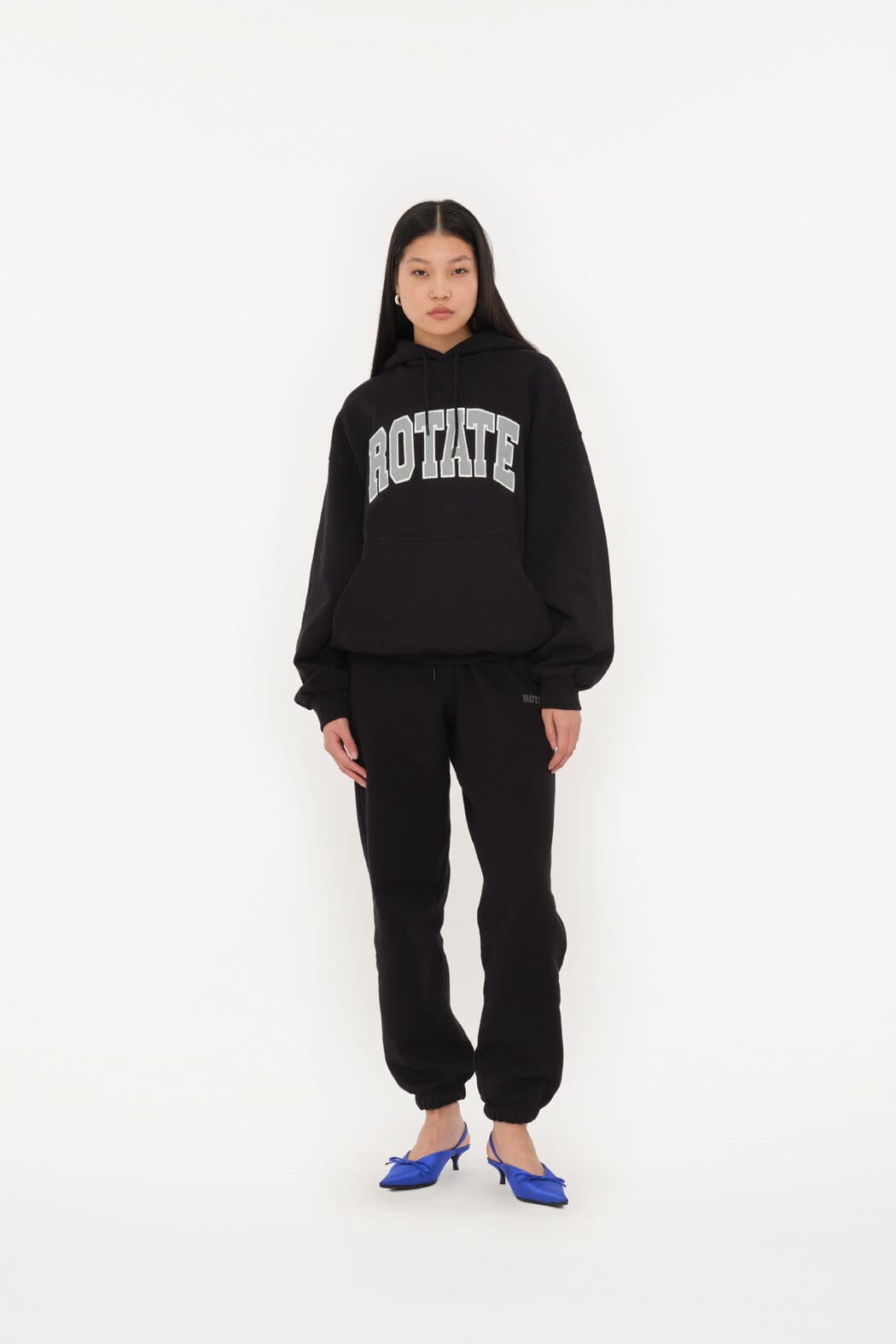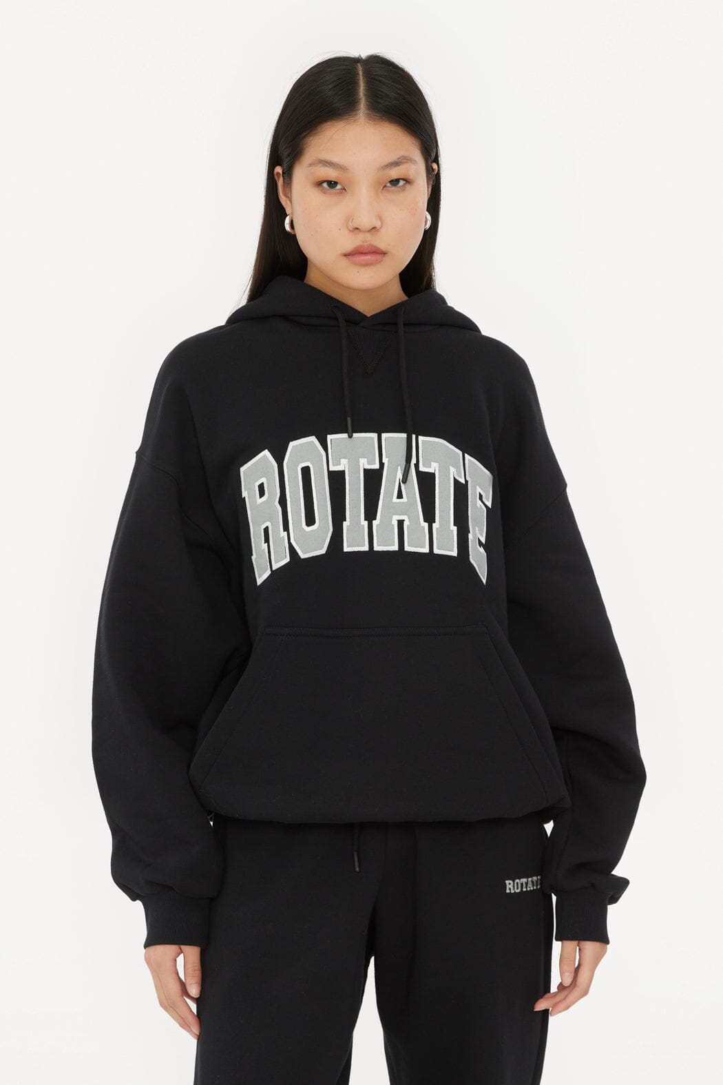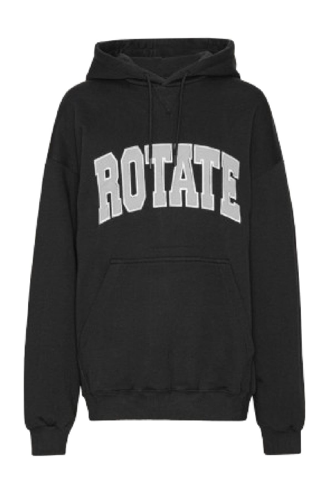 Musta huppari Rotate-merkkiltä, jossa harmaa logopainatus edessä. Hupparissa on kengurulompakko edessä ja huppu, jossa on naru.