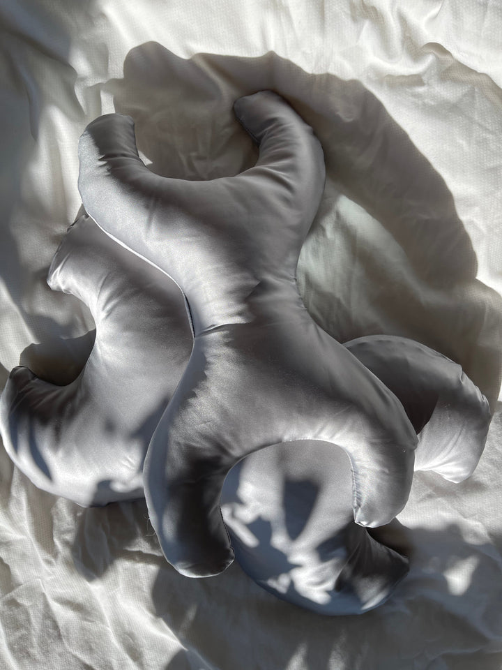 Pehmuste Save My Facelta hopeanvärisestä charmeuse-silkistä. Pehmusteessa on sileä pinta ja se on suunniteltu La Petite -tyynylle, jossa on tunnusomainen X-muoto.
