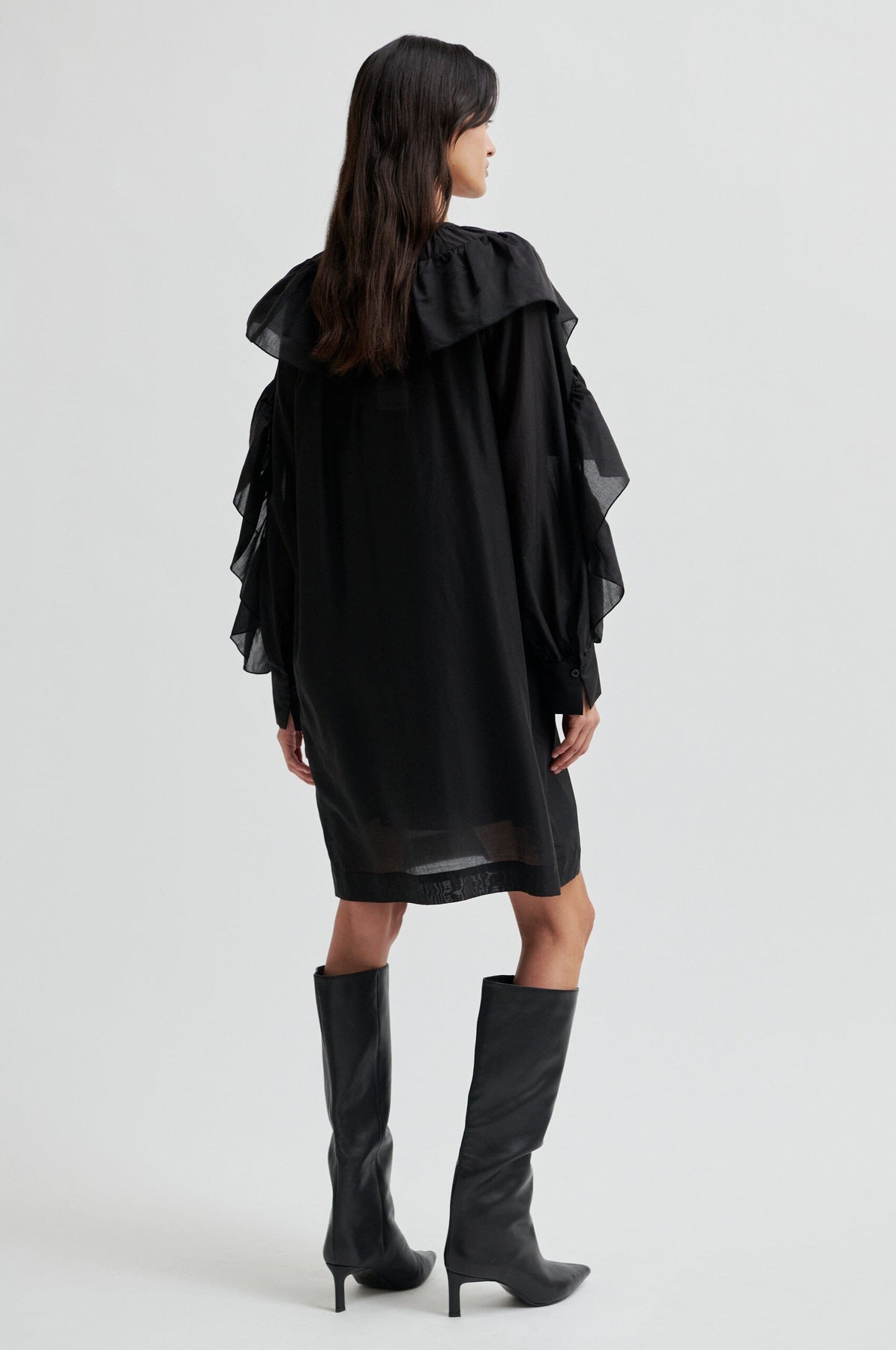 Musta mekko Second Femalelta, jossa on vinot röyhelöyksityiskohdat pääntiellä ja hihoissa. Mekossa on väljä istuvuus ja se on valmistettu kevyestä, puoliläpinäkyvästä materiaalista.