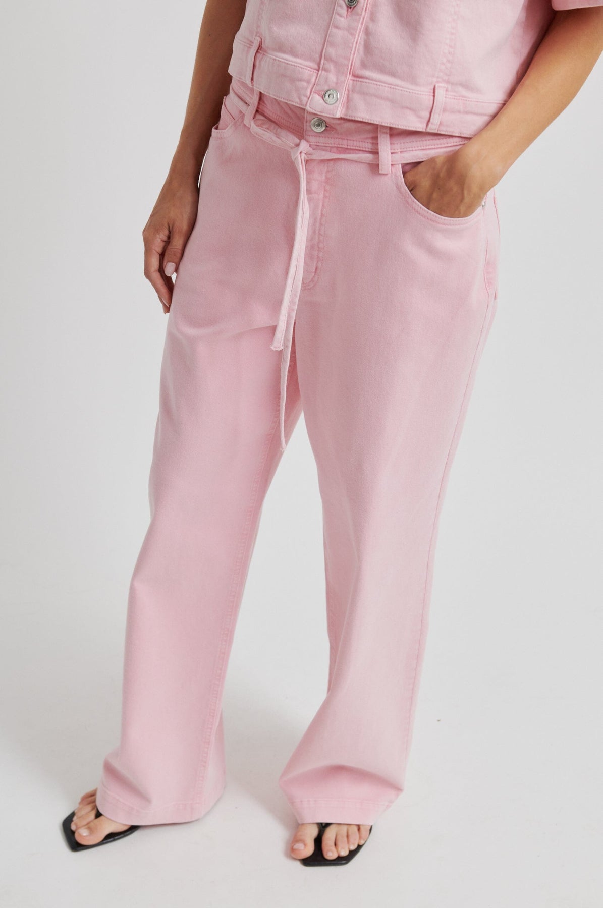 - Keskikorkea vyötärö ja solmittava vyö