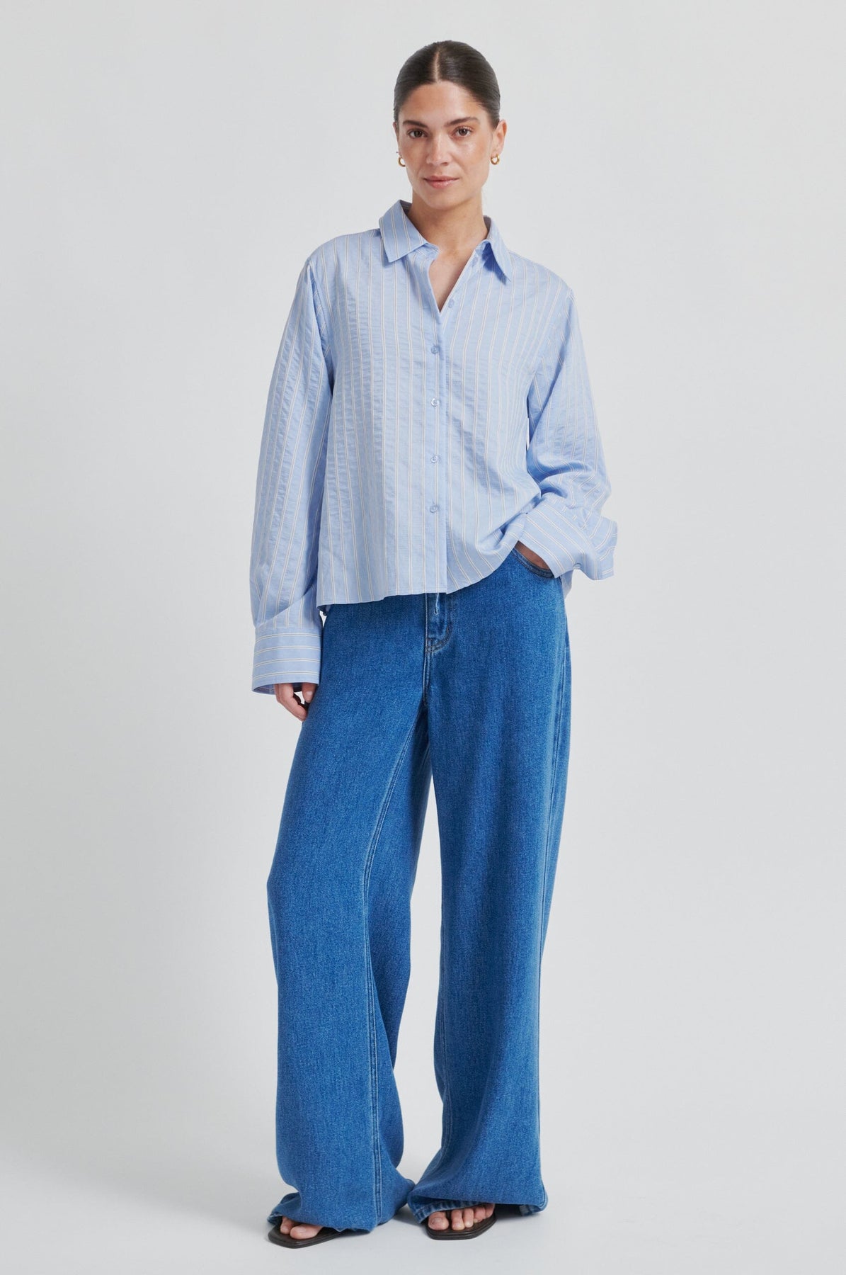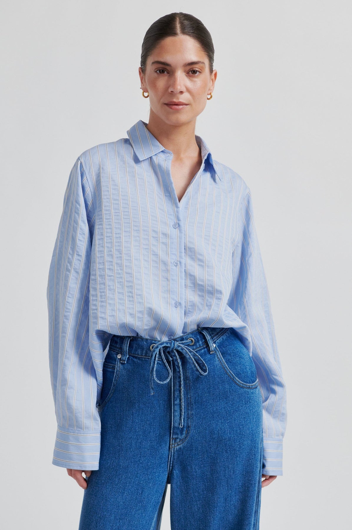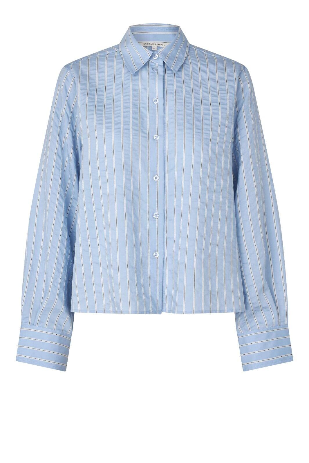 Vaaleansininen paita, jossa on valkoiset raidat, Second Female -merkiltä. Paita on valmistettu pehmeästä sekoitteesta, joka sisältää 72 % viskoosia, ja siinä on lyhyt ja väljä mitoitus.