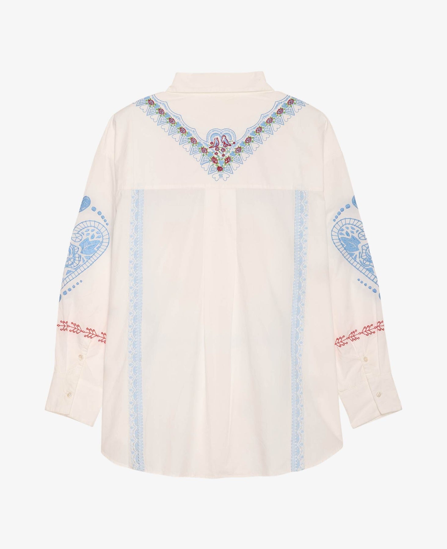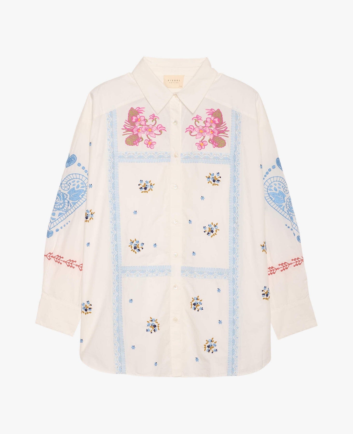 Valkoinen paita Sissel Edelbolta, jossa on kirjailtuja kukkia ja sydämiä vaaleanpunaisen ja sinisen sävyissä sekä hienot pitsiyksityiskohdat hihojen entlang.