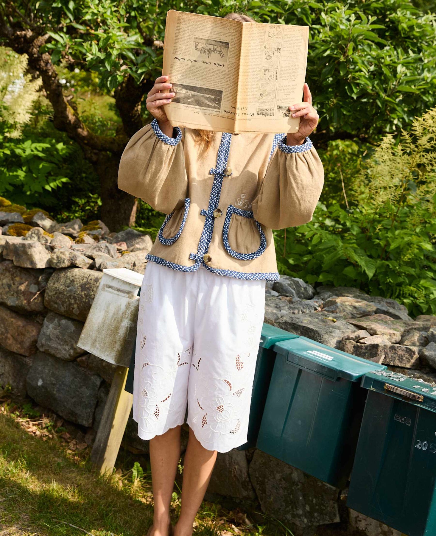 Sissel Edelbon takki hiekanvärisestä puuvillatvillistä, jossa on siniset kuviolliset boucléreunukset kauluksessa, hihoissa ja taskuissa.