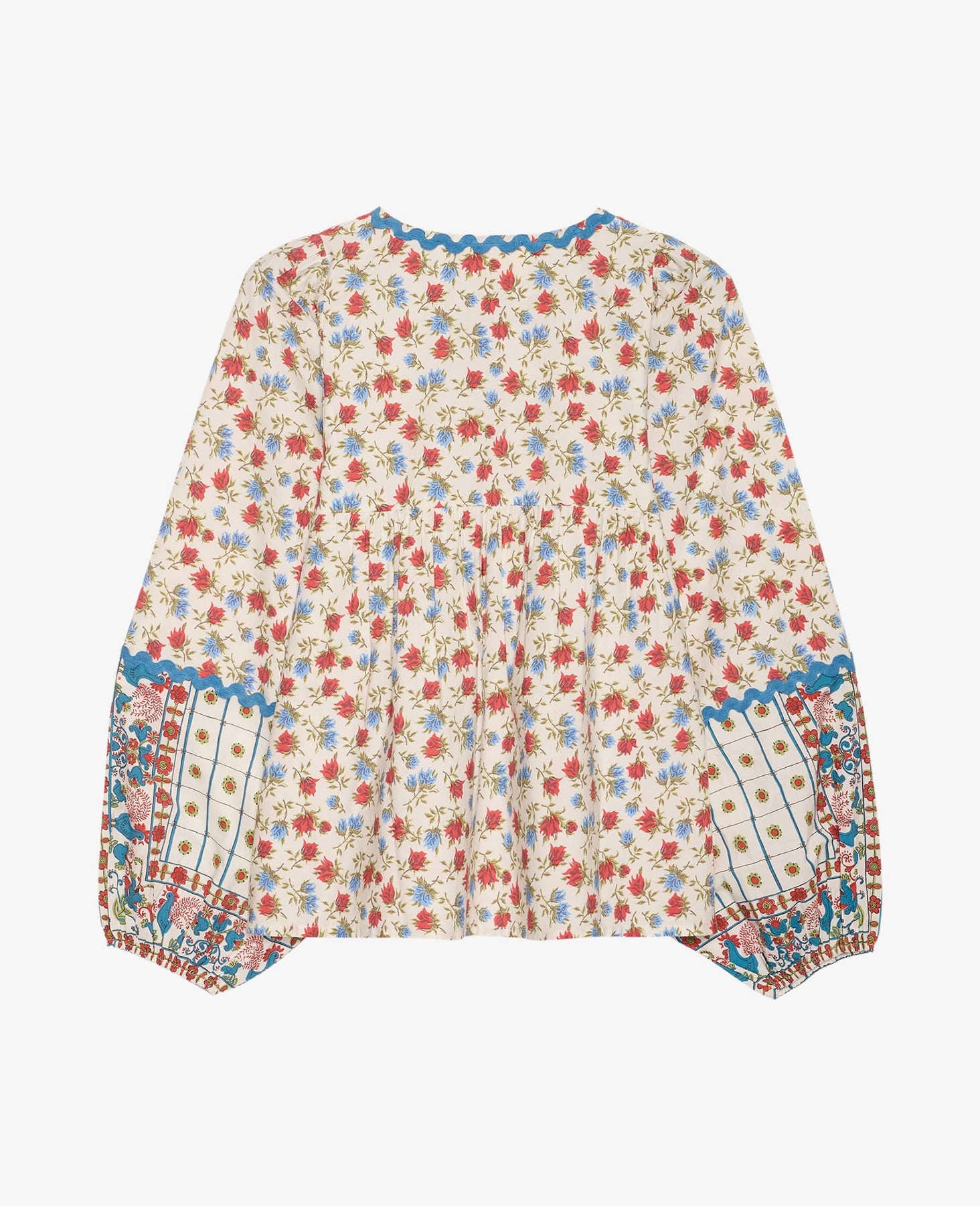 Sissel Edelbon pusero, jossa monivärinen kukkakuvio punaisen ja sinisen sävyissä kermanvalkoisella pohjalla. Pusero sopii sekä arkeen että juhlavampiin tilaisuuksiin.