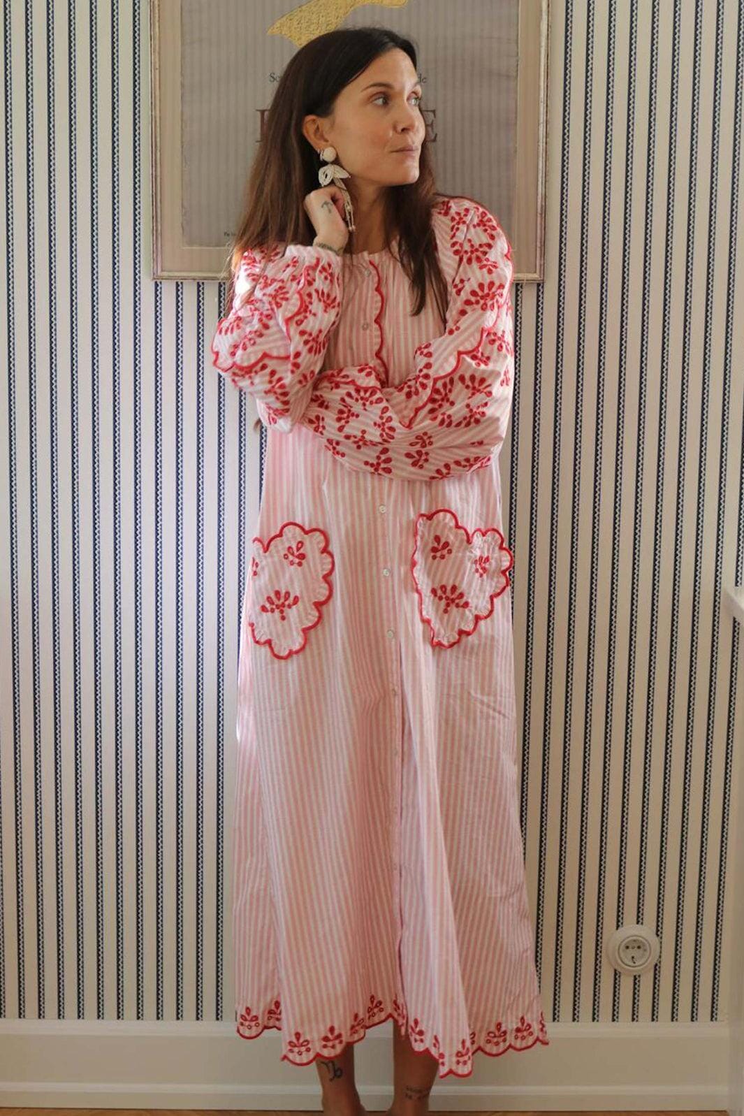 Raidallinen mekko Sissel Edelbolta punaisena ja valkoisena. Mekko on valmistettu 100 % luomupuuvillasta, jossa on kirjailuja ja koristeompeleita.