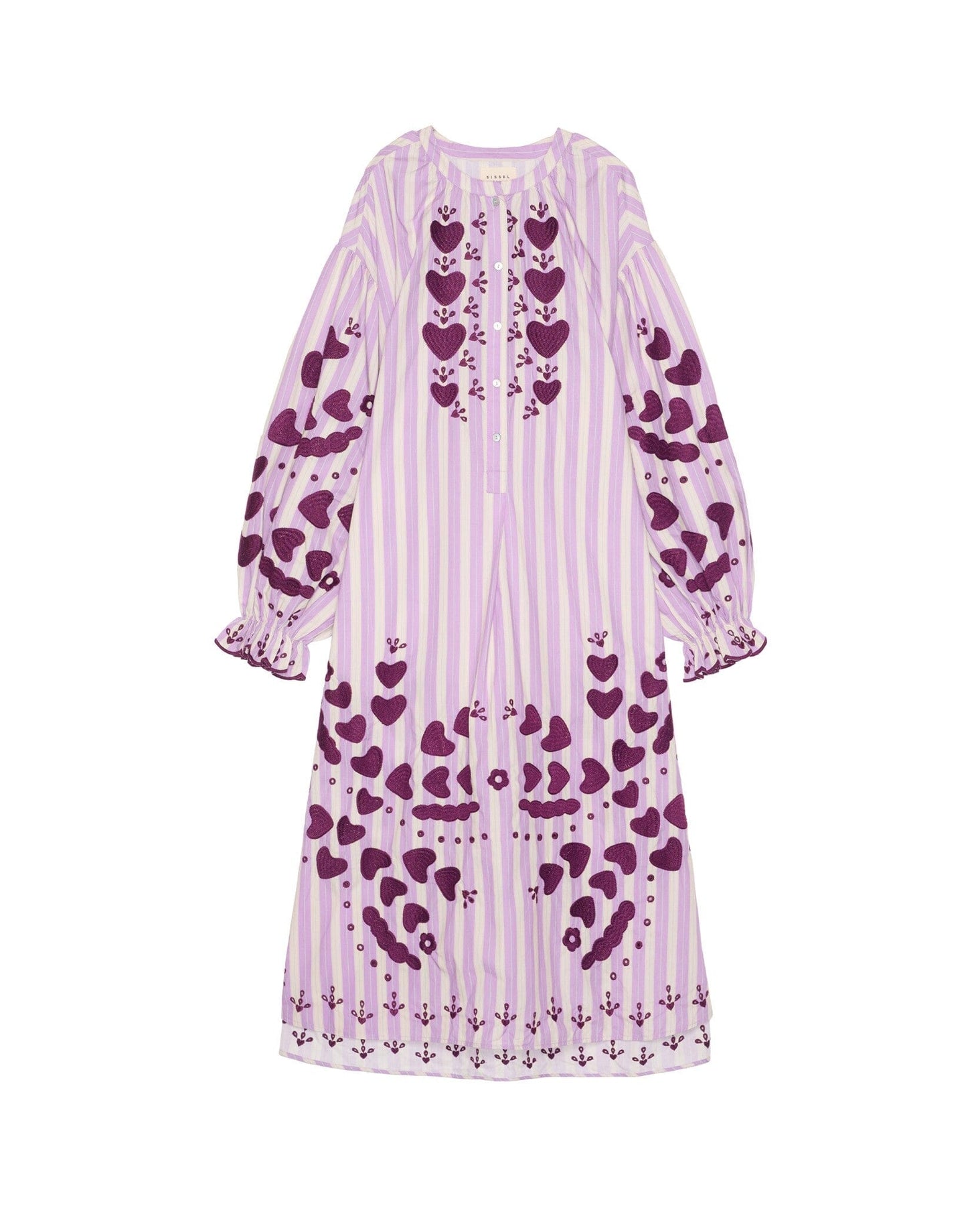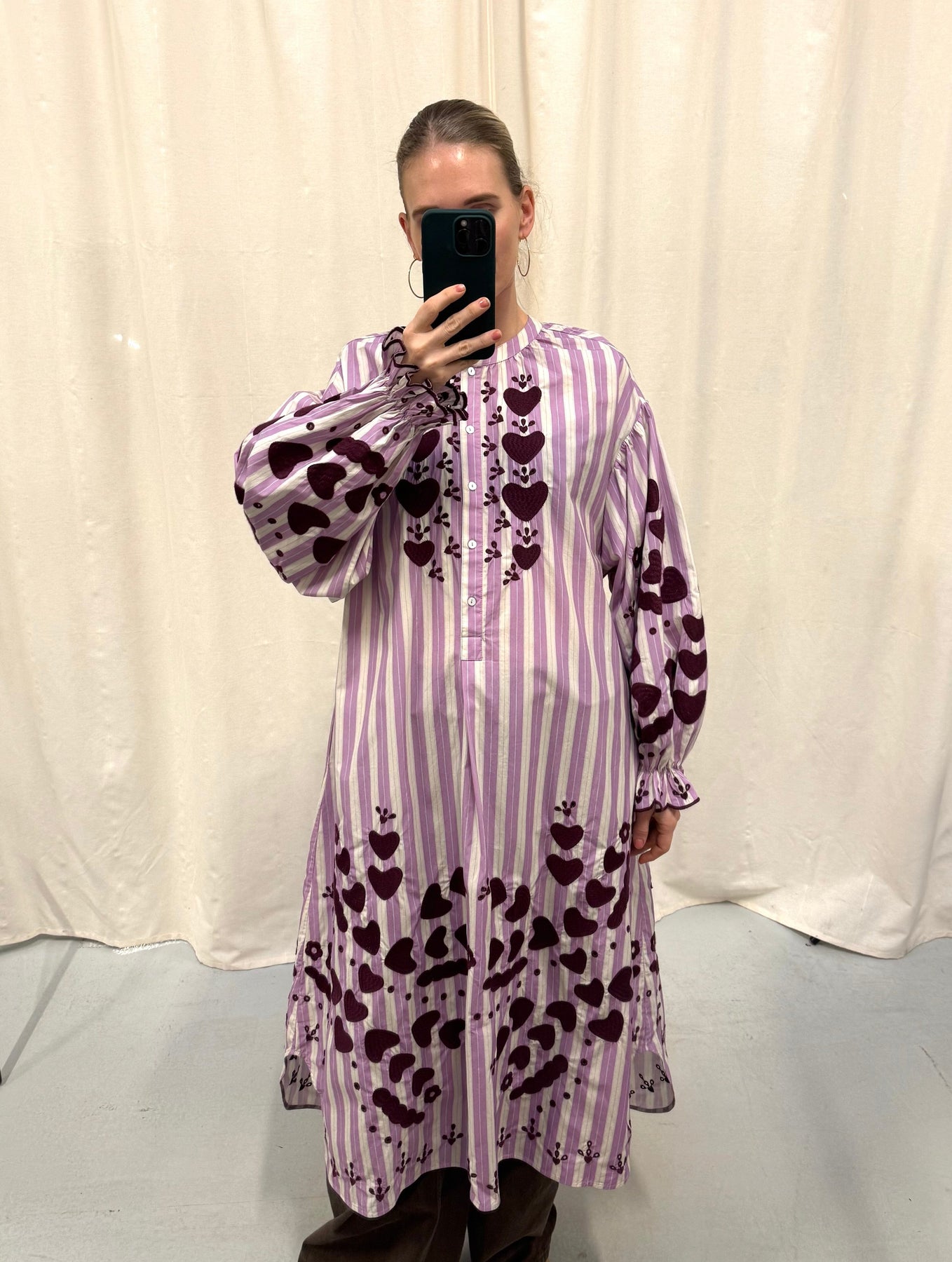 Raidallinen mekko Sissel Edelbolta liilan ja valkoisen sävyissä, tummanliiloilla sydän- ja kukkakirjailuilla. Mekossa on lankavärjätyt raidat ja se on valmistettu luomupuuvillasta.