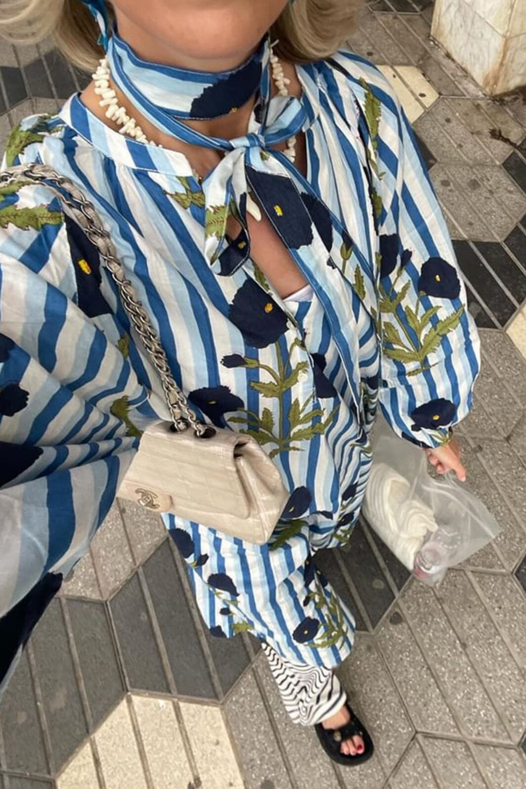 Raidallinen mekko Sissel Edelbo: lta ekologisesta puuvillasta. Mekossa on sinisiä ja valkoisia raitoja tummansinisellä ja vihreällä kukkakuviolla, V-pääntie ja pitkät pallomaiset hihat.