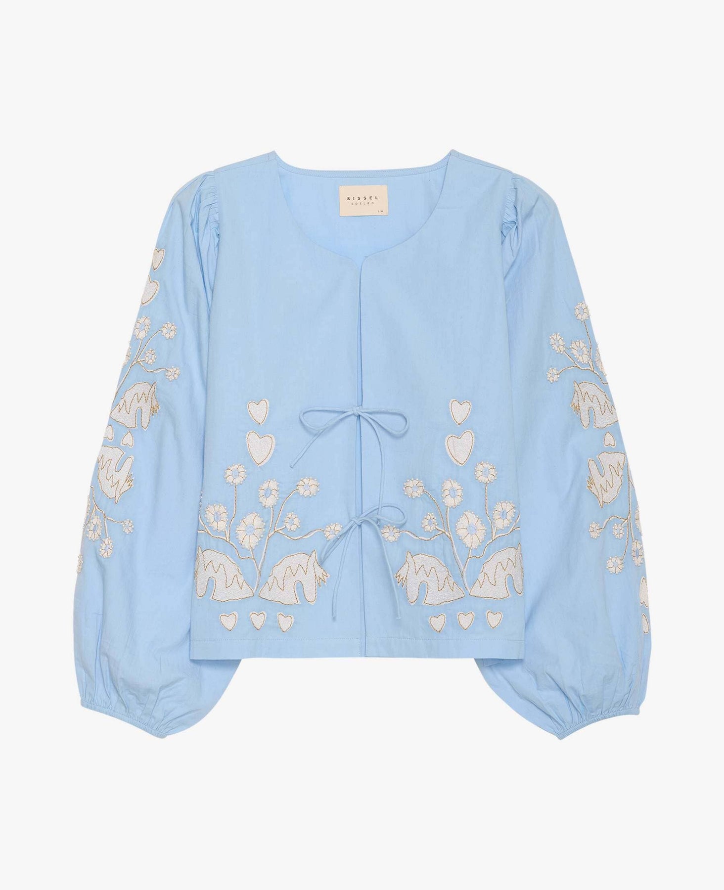 Vaaleansininen paita Sissel Edelbolta, jossa on kirjailtuja sydämiä ja kukkia edessä ja hihoissa. Paidassa on solmimisdetaljit edessä ja helmikoristeita.