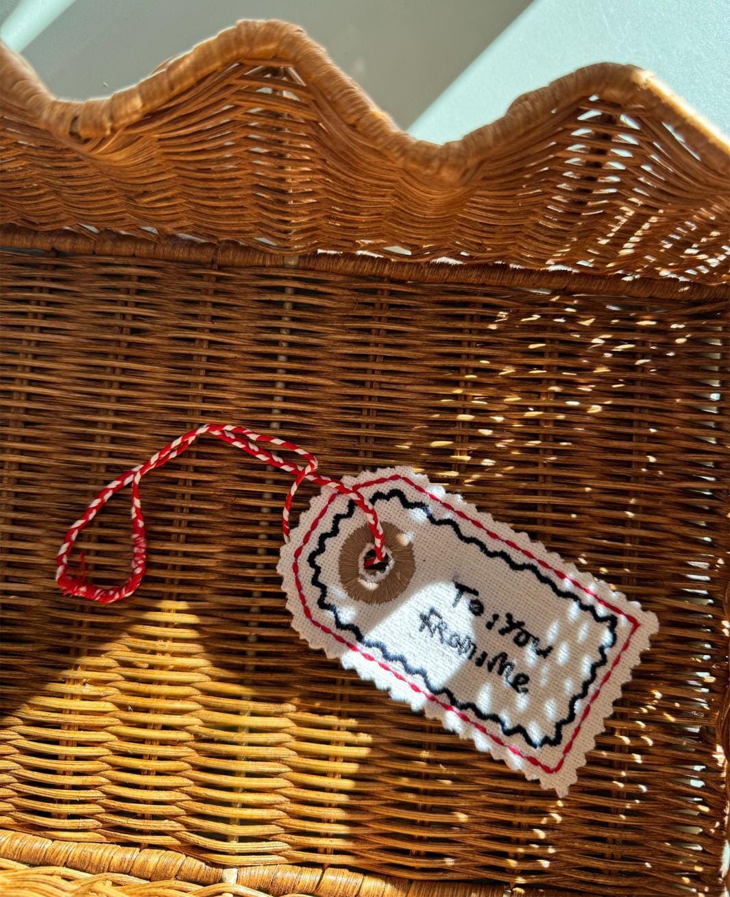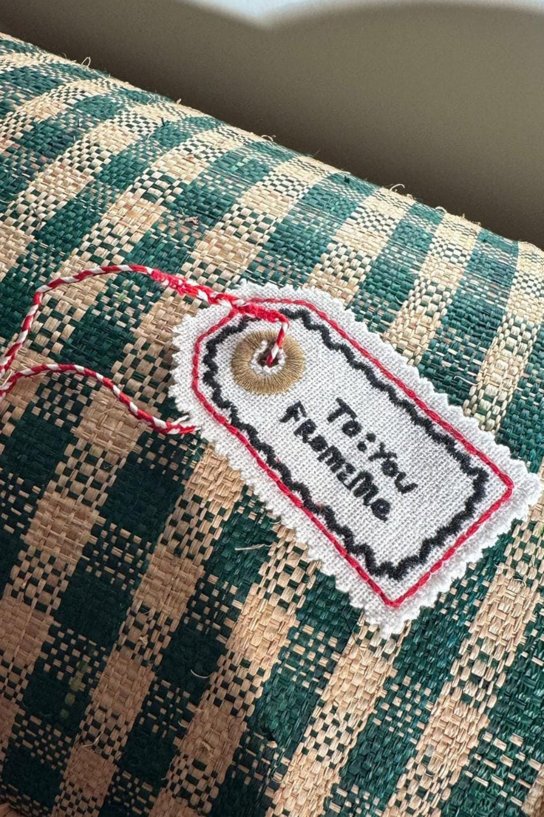 Tagkoriste Sissel Edelbo -merkkiltä, valmistettu ylijäämä tweed bouclé -kankaasta. Koriste on suorakulmainen, jossa on scallop-reunat ja punavalkoinen punottu naru.