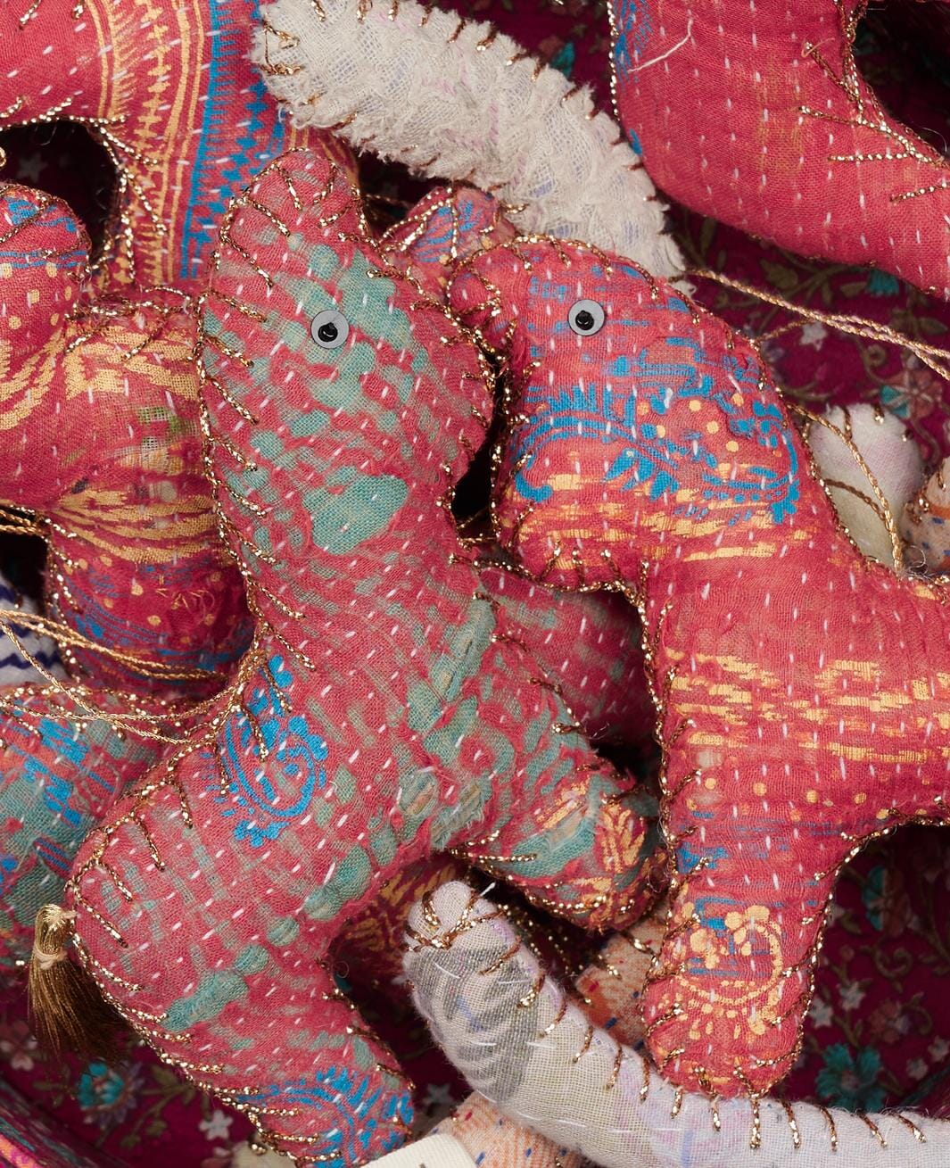 Keinukavio-ornamentti Sissel Edelbolta, valmistettu kantha-peittojen jäännöksistä, joissa on kultainen lurex-ompelu. Ornamentilla on punainen runko, jossa on sinisiä kuvioita.