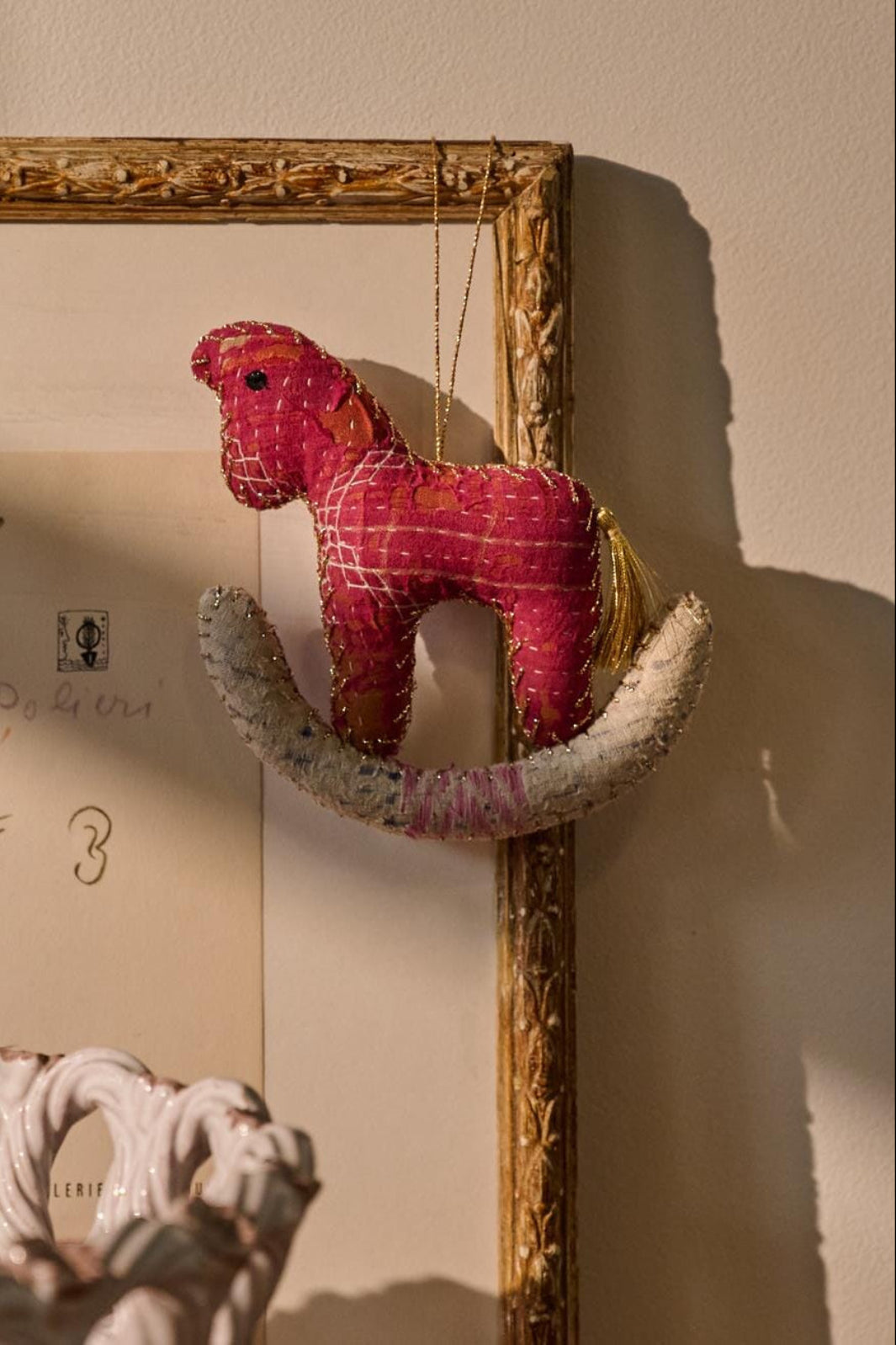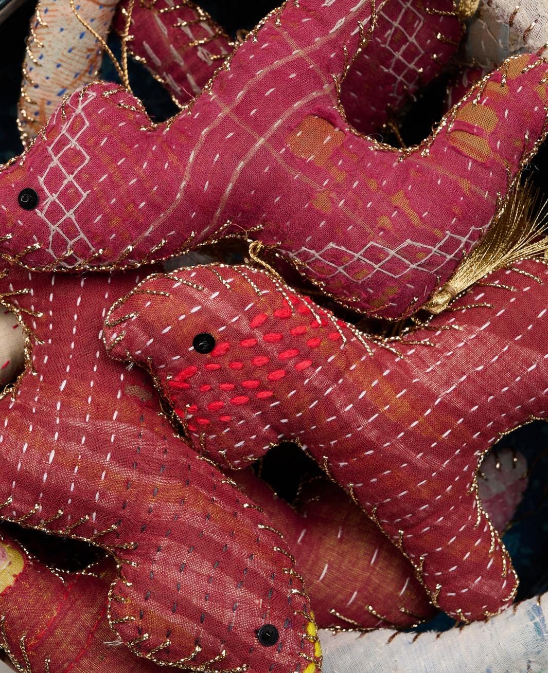 Keinukenttä-ornamentti Sissel Edelbolta käsintehdyillä yksityiskohdilla. Ornamentti on valmistettu Kantha-ompelutekniikalla ja siinä on kaareva pohja, jossa on kultainen naru ripustamista varten.