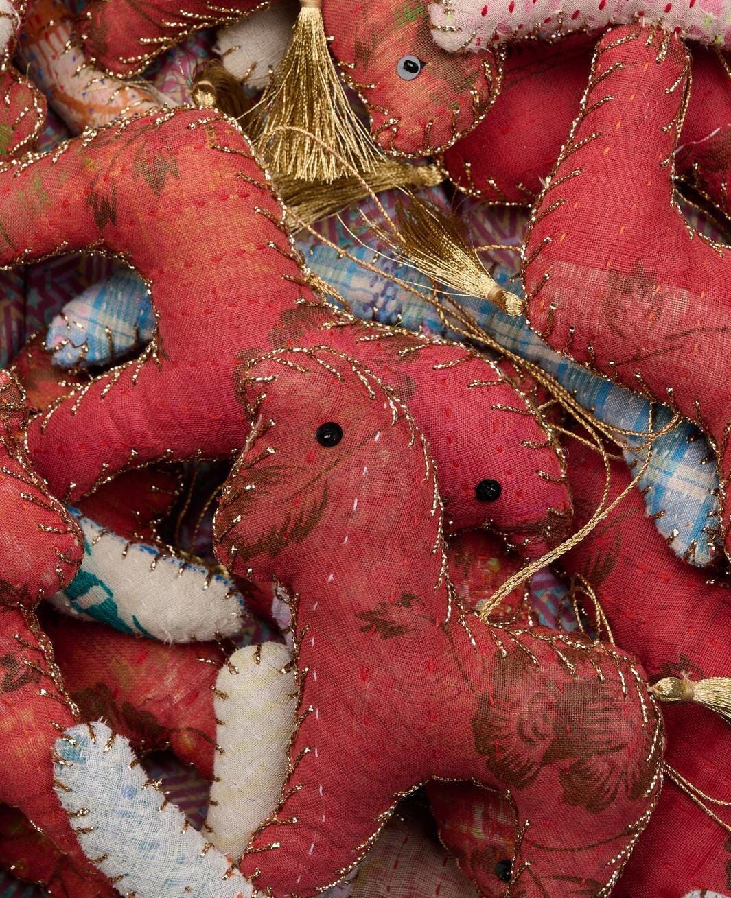 Keinukenttä-ornamentti Sissel Edelbolta, valmistettu kantha-peittojen jäännöksistä. Jokaisella ornamentilla on punainen runko, valkoinen pohja ja kultainen tupsu.